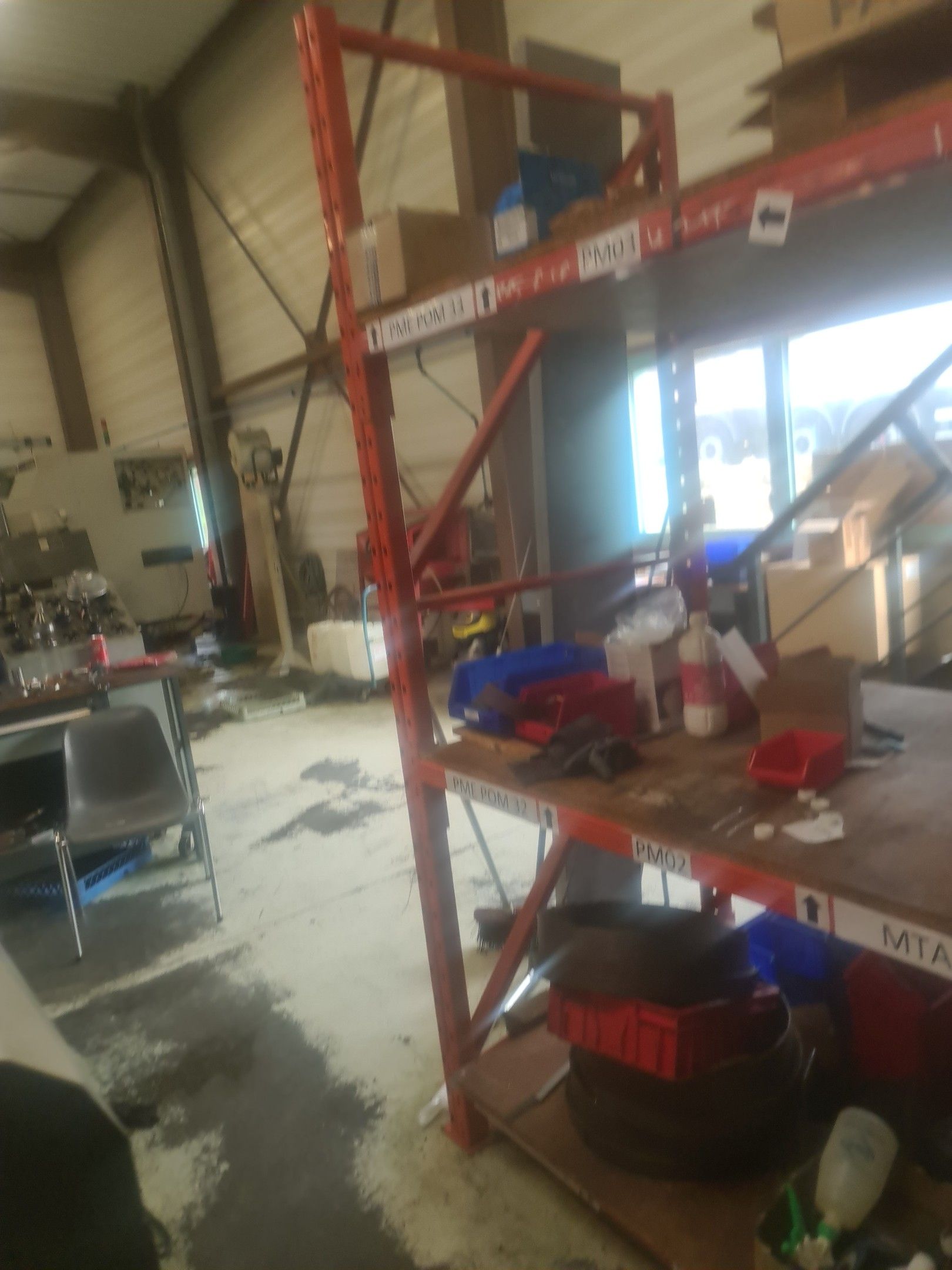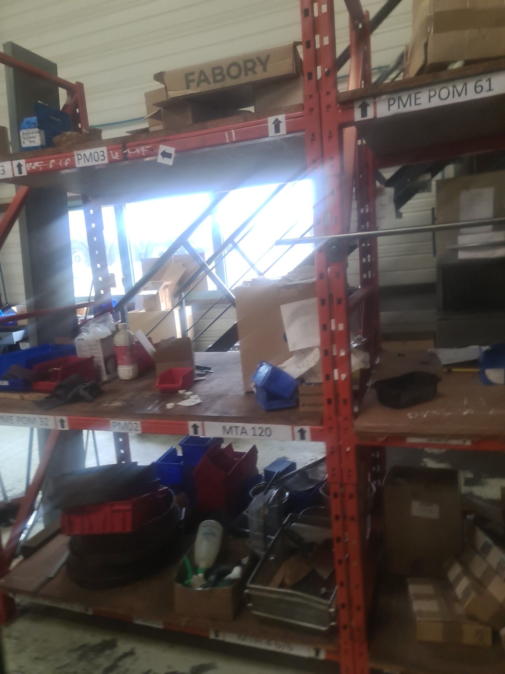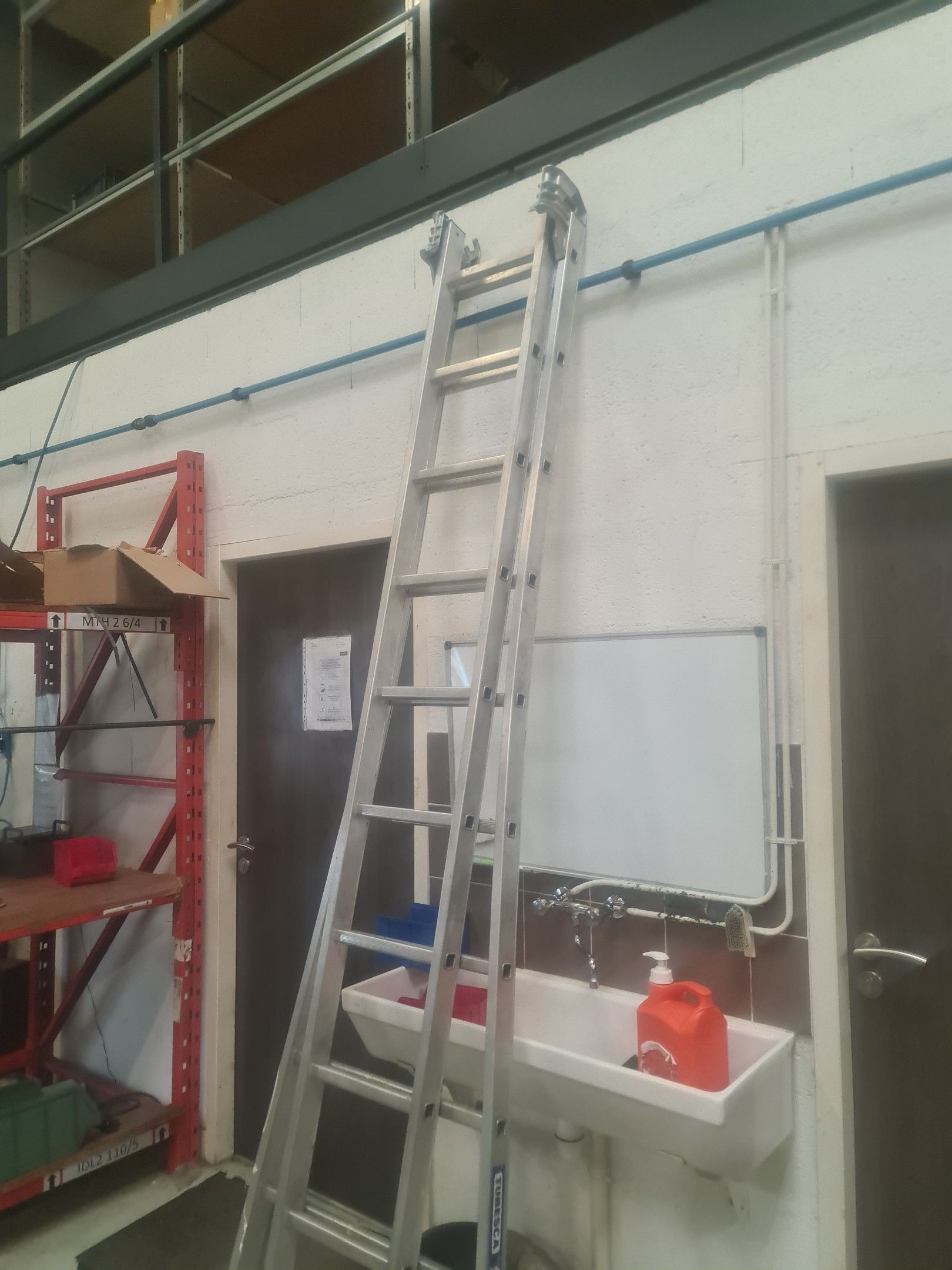 orange metal rack with laminated top, approximately three linear metres by three high metres, ladder, scales