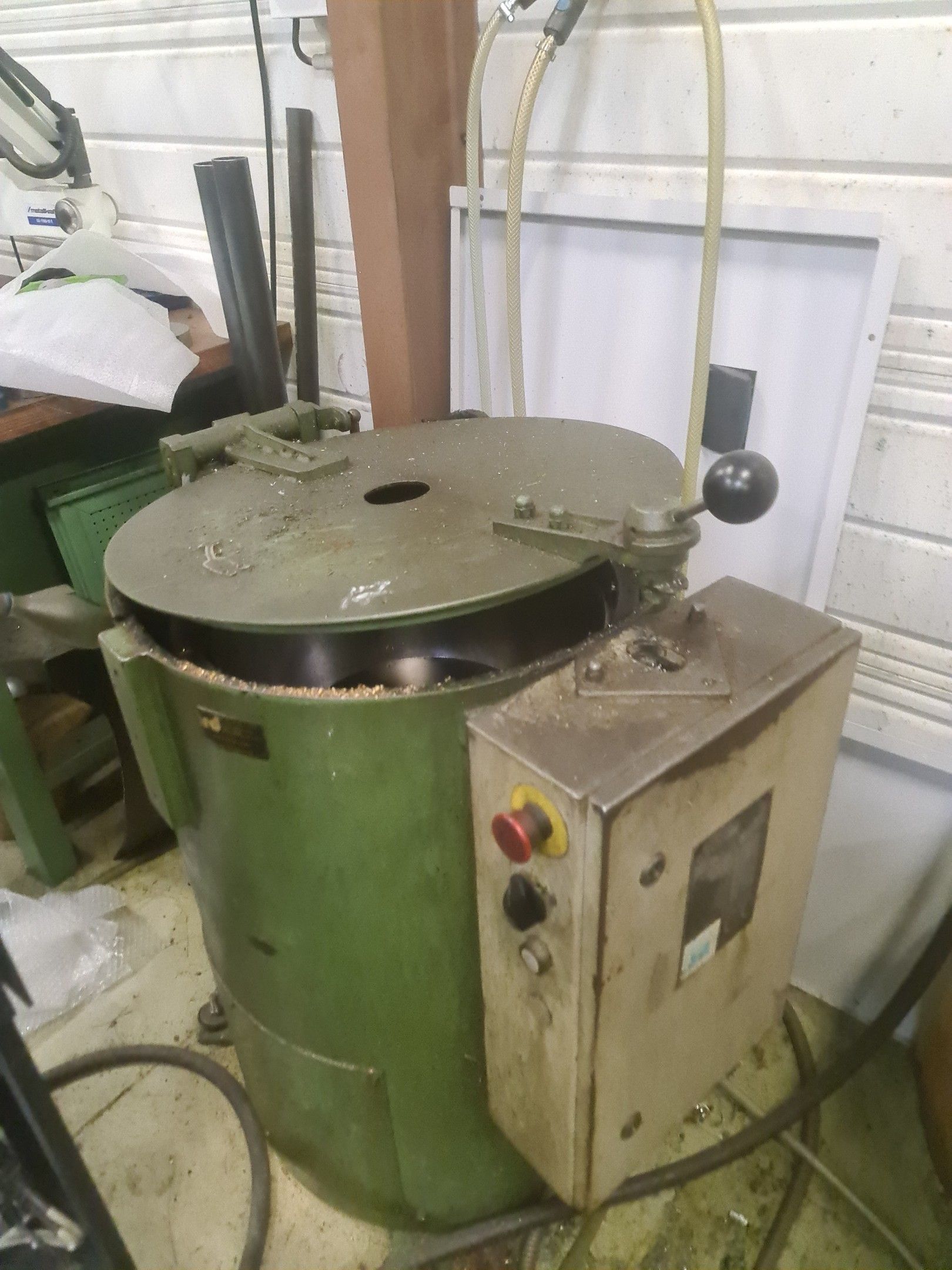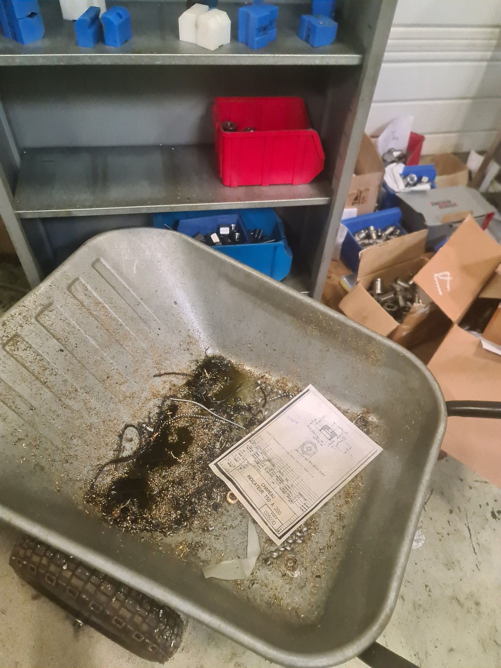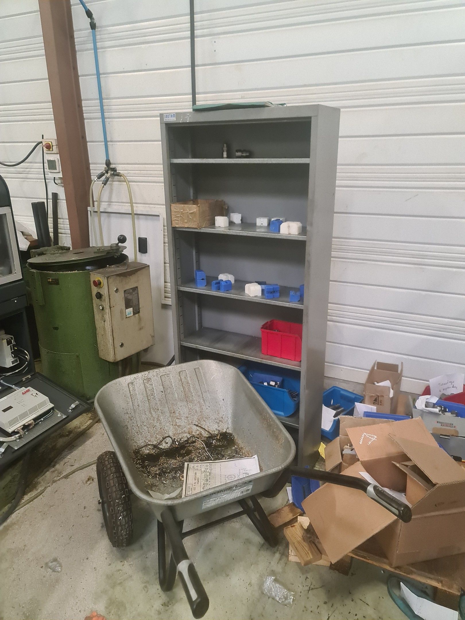 a STEIMEL chip wringer model CB year 1999, a metal cupboard, wheelbarrow, metal parts