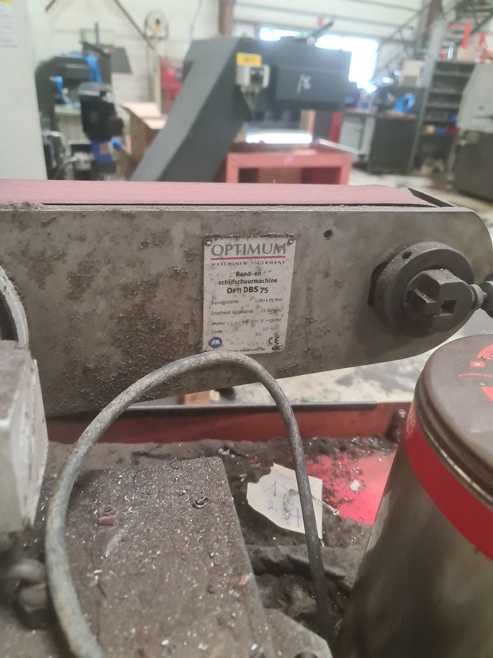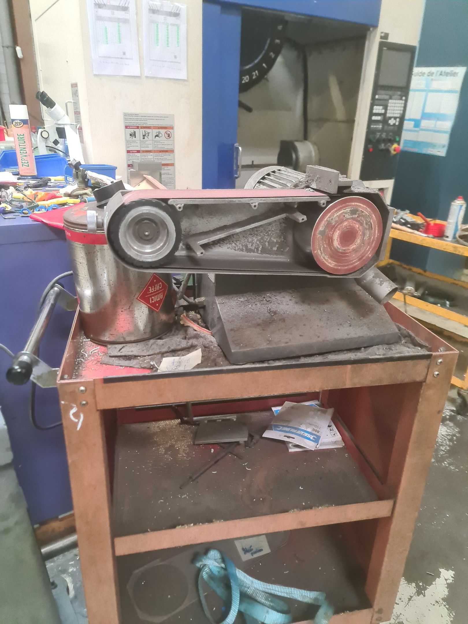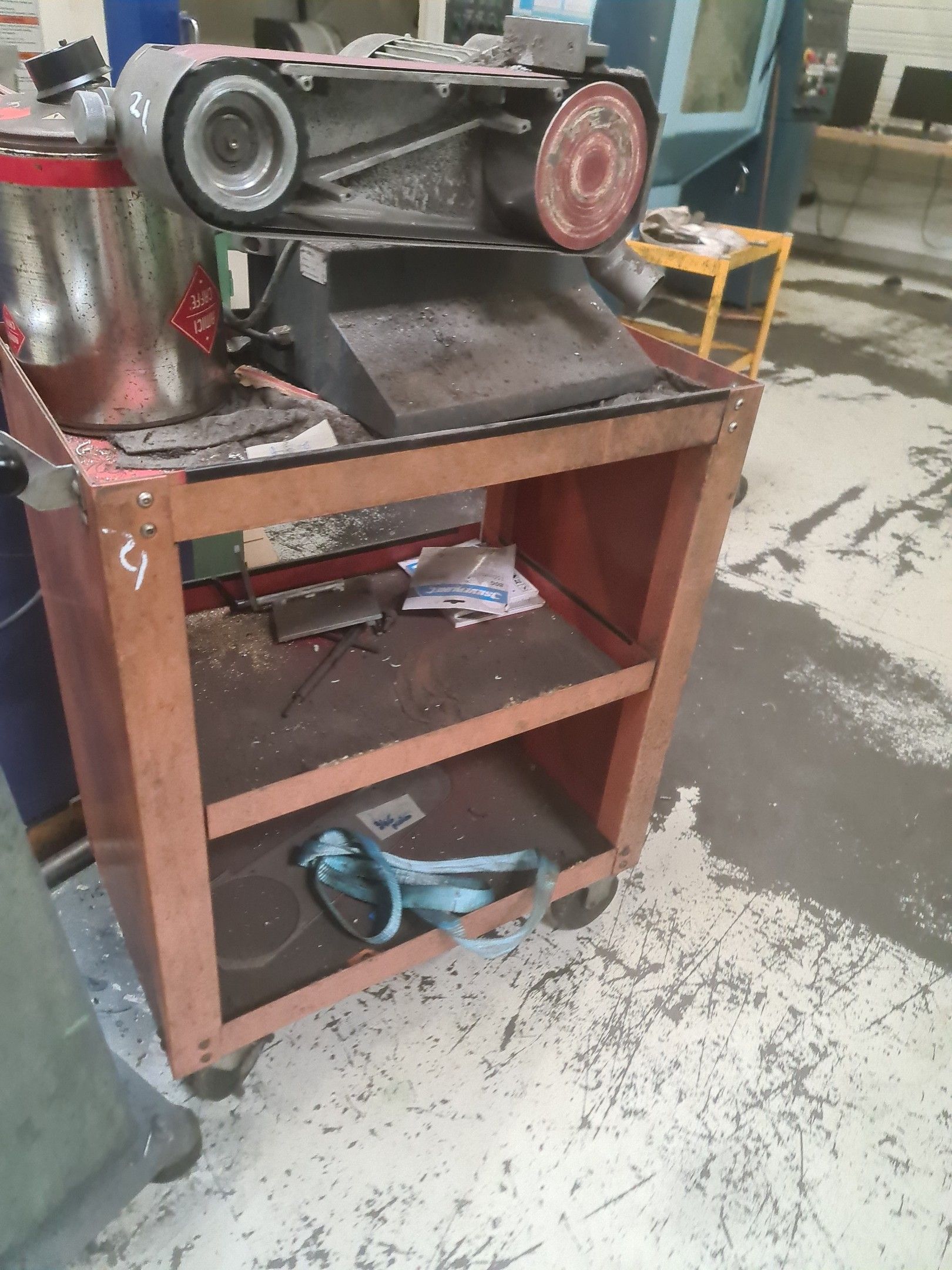 a red metal sideboard with three trays, an OPTIMUM belt sander, a two-head router