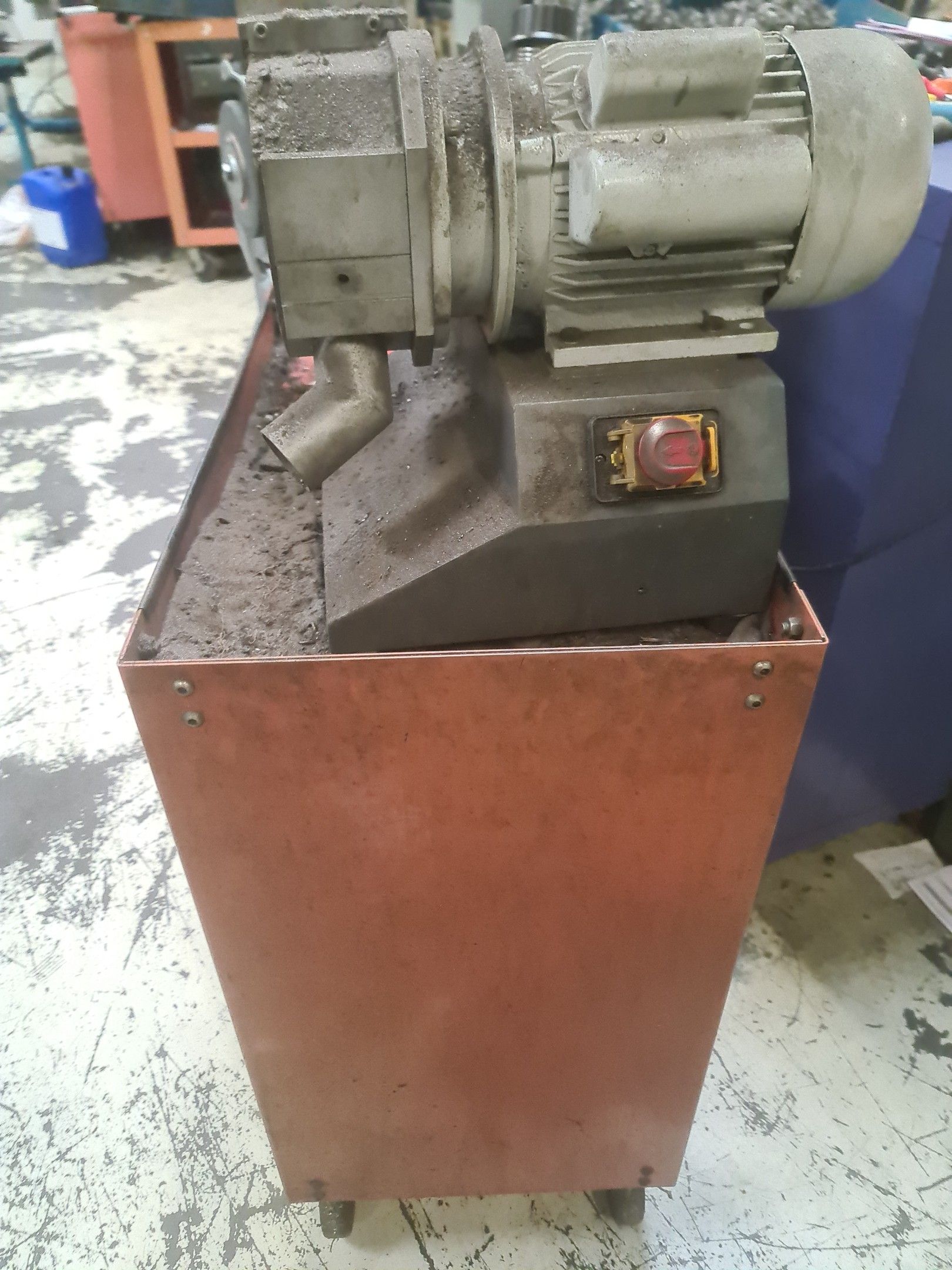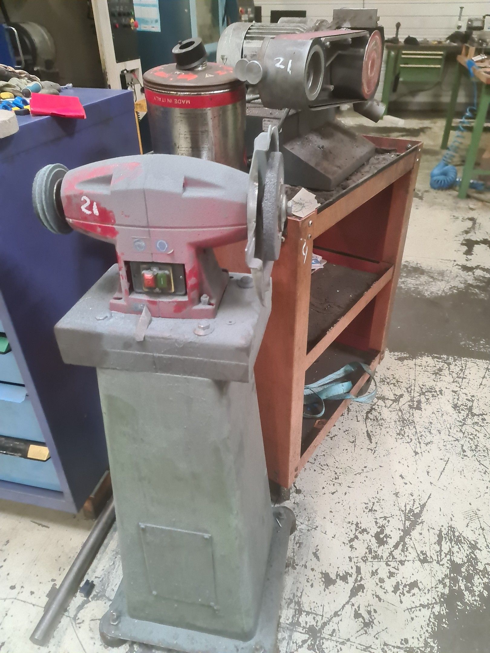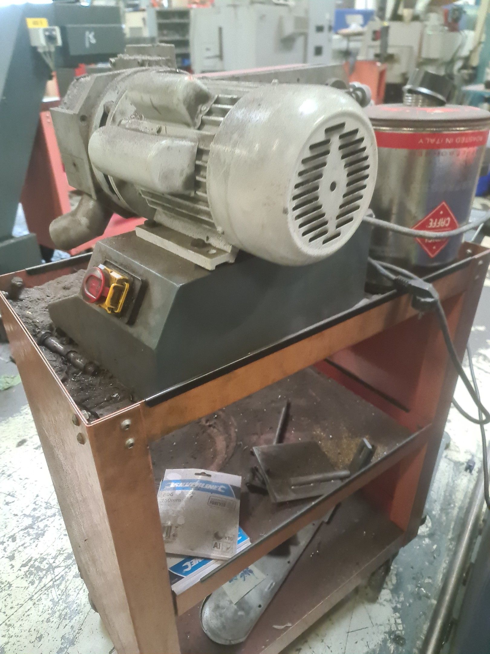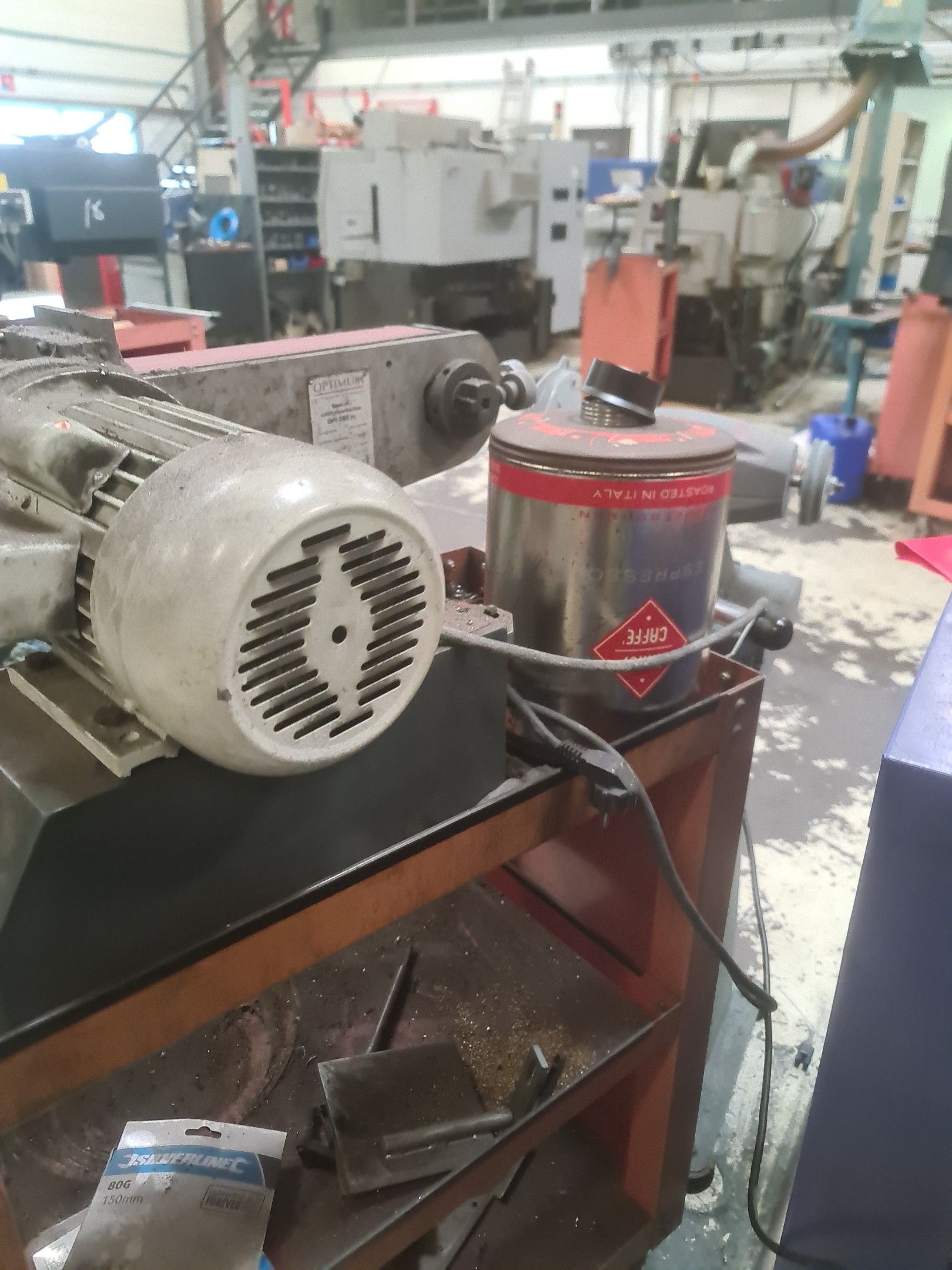 a red metal sideboard with three trays, an OPTIMUM belt sander, a two-head router