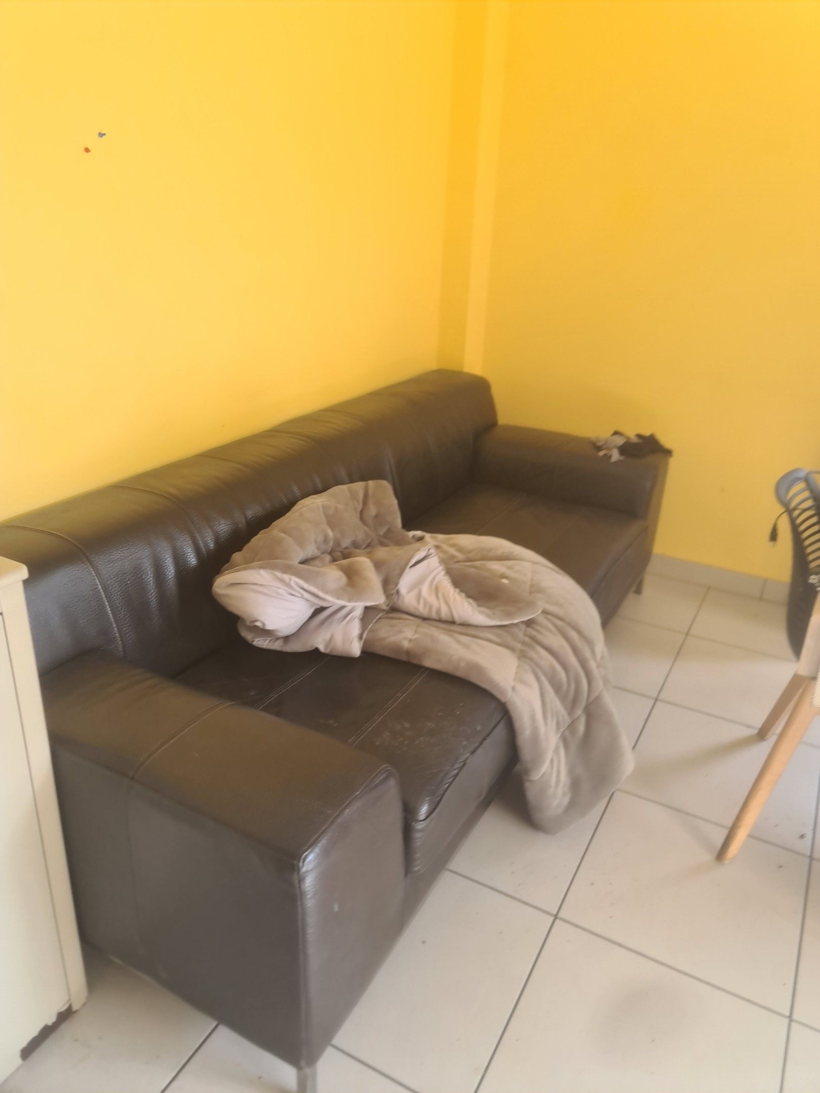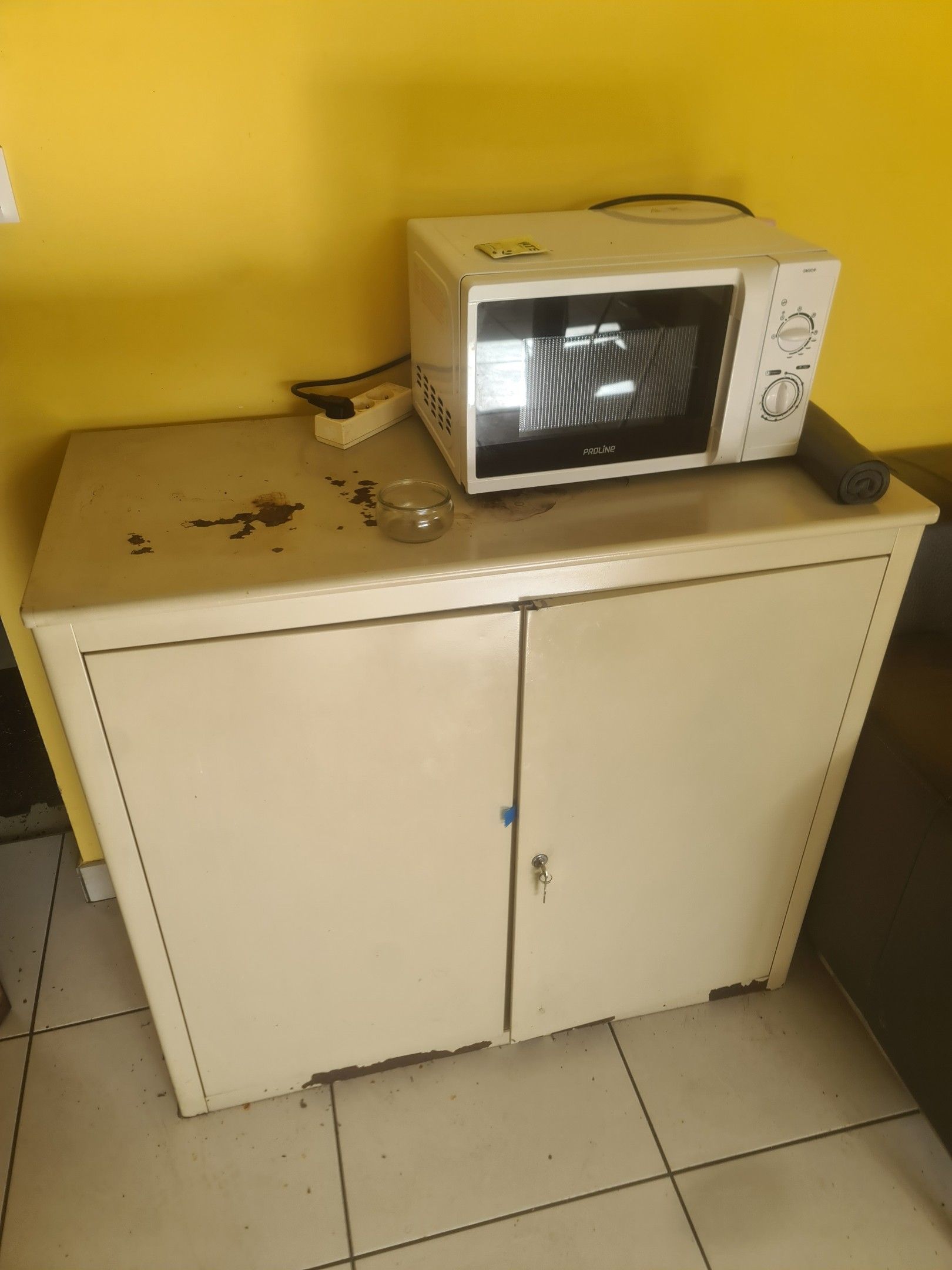 a Proline microwave, a metal cupboard base, a brown leather four-seater sofa, a laminated table with ten place settings, a metal sideboard with wire basket, 3 grey plastic conference chairs and a laminated and plastic Scandinavian-style chair