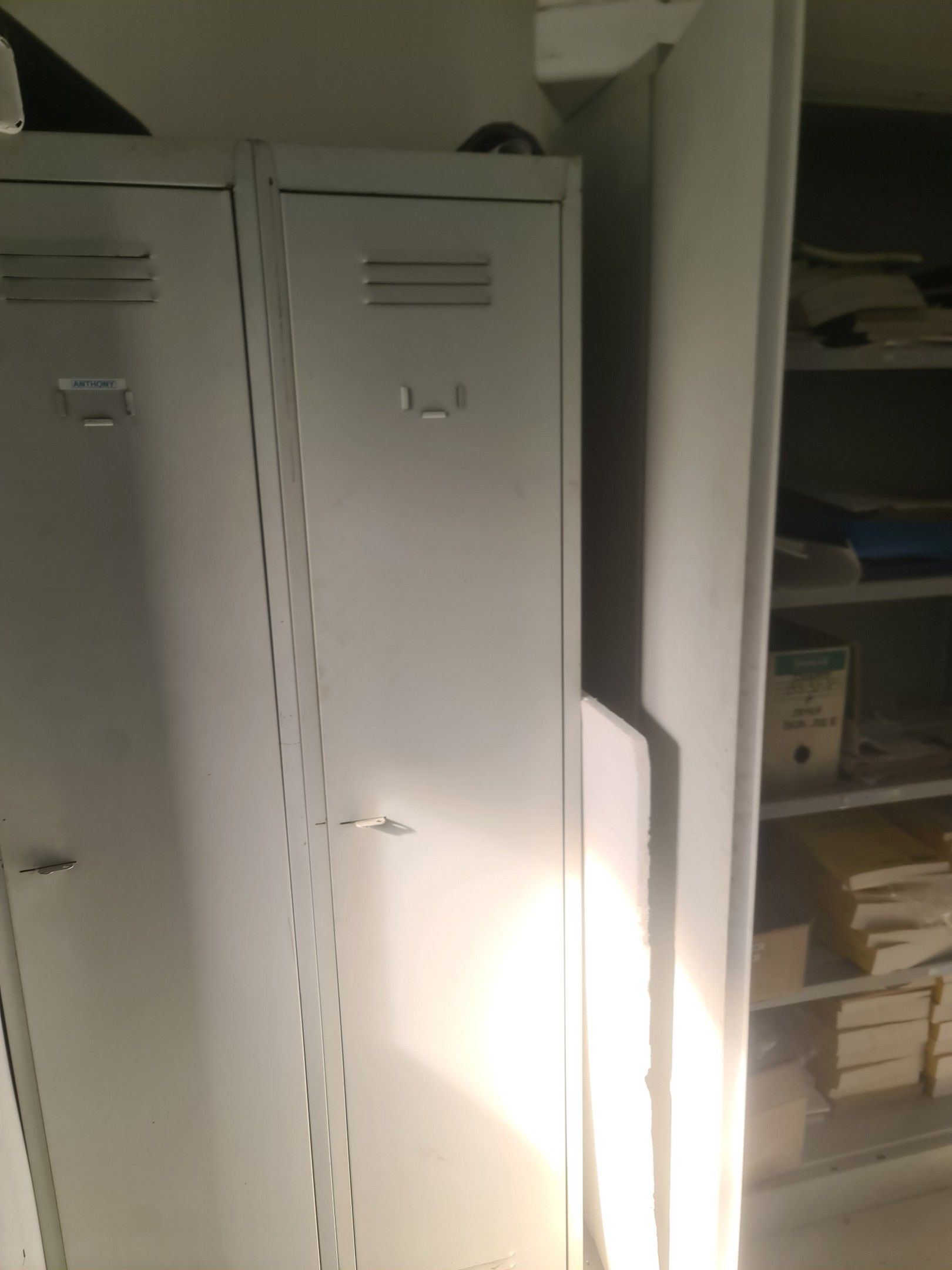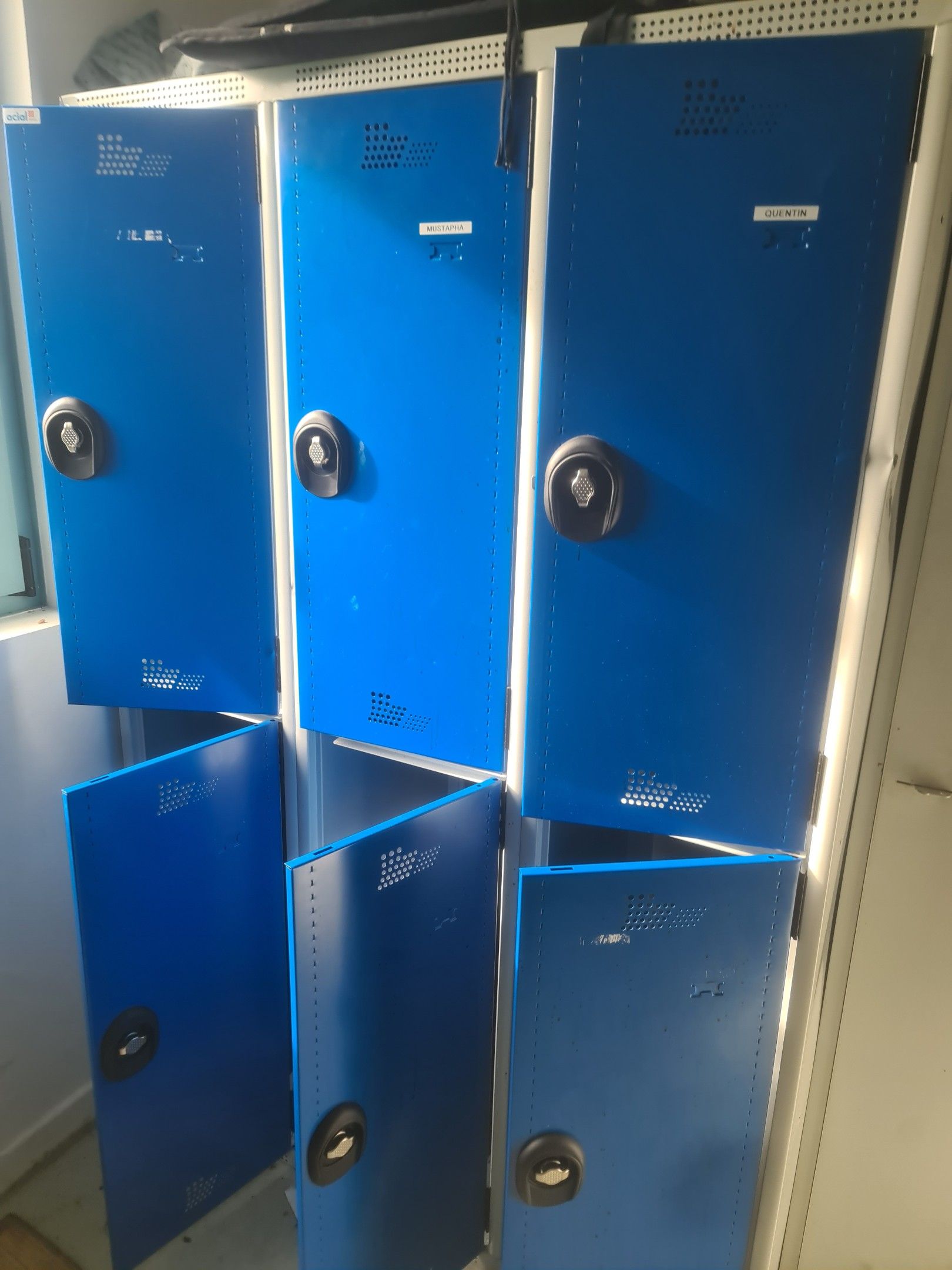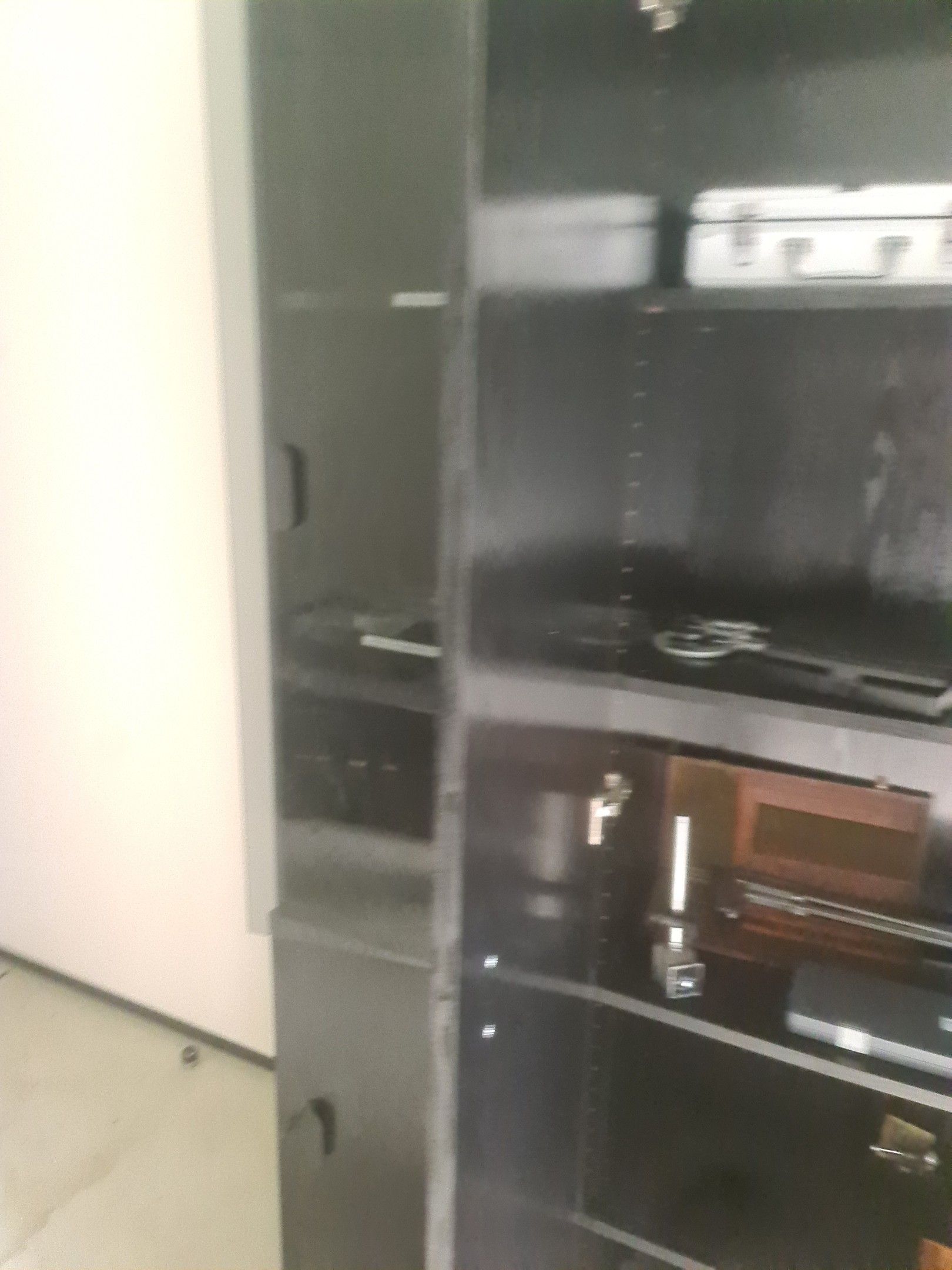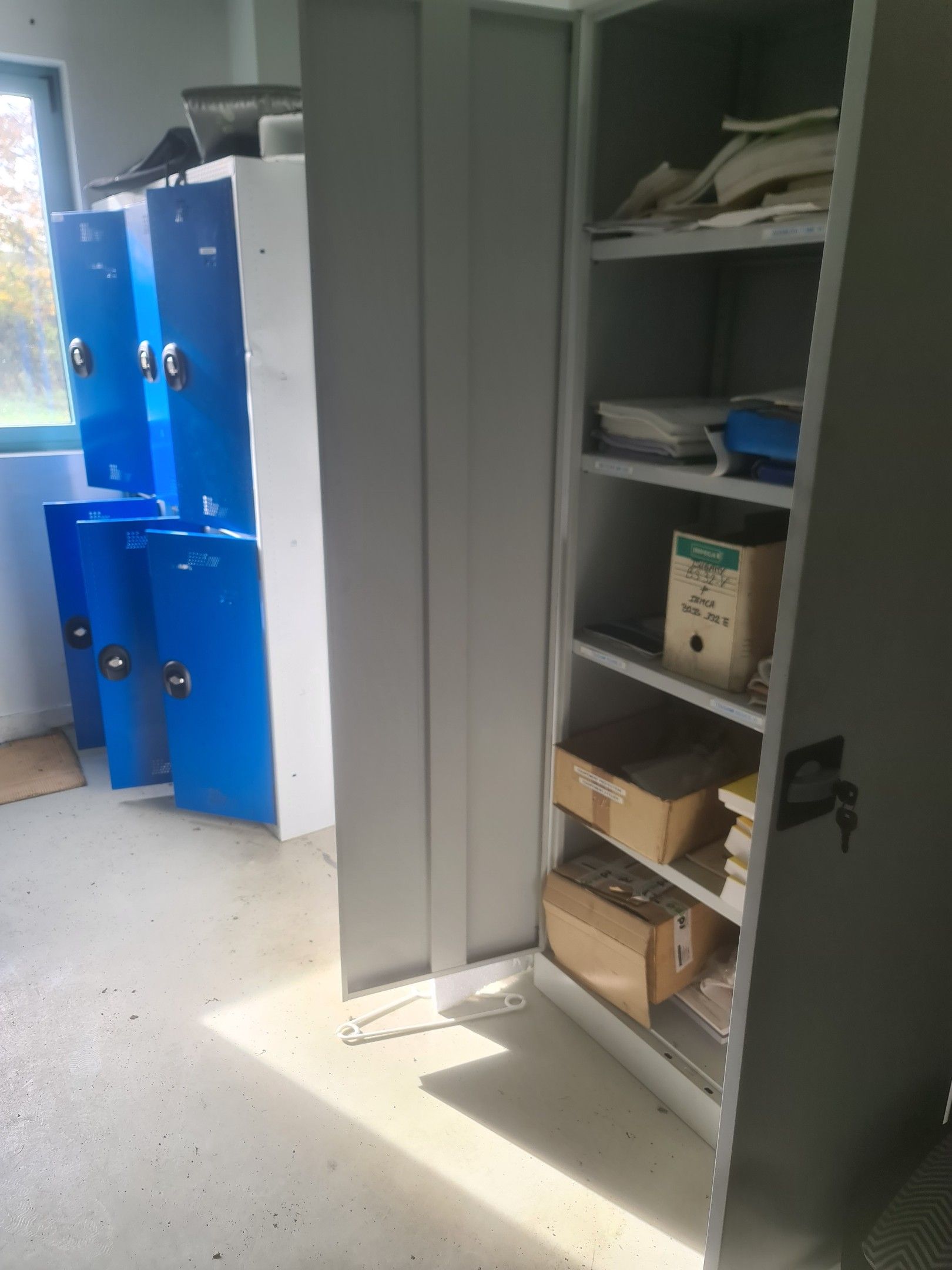 grey and blue metal cloakroom with six lockers, metal cloakroom, column, two lockers, grey metal cupboard, black laminated cupboard with glazed bookcase section