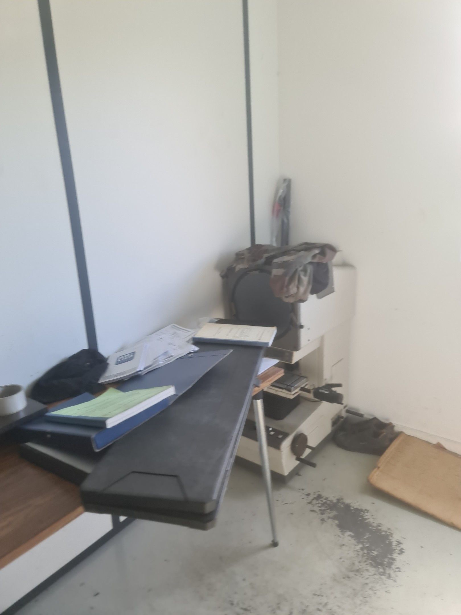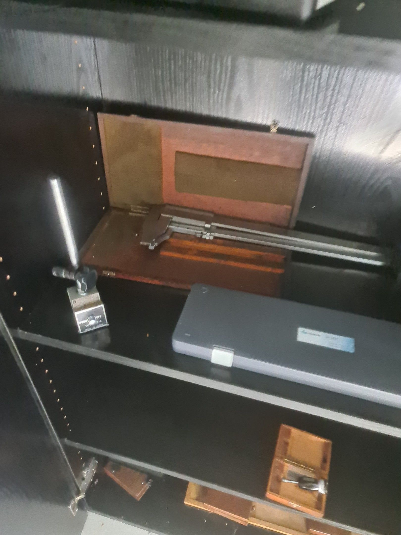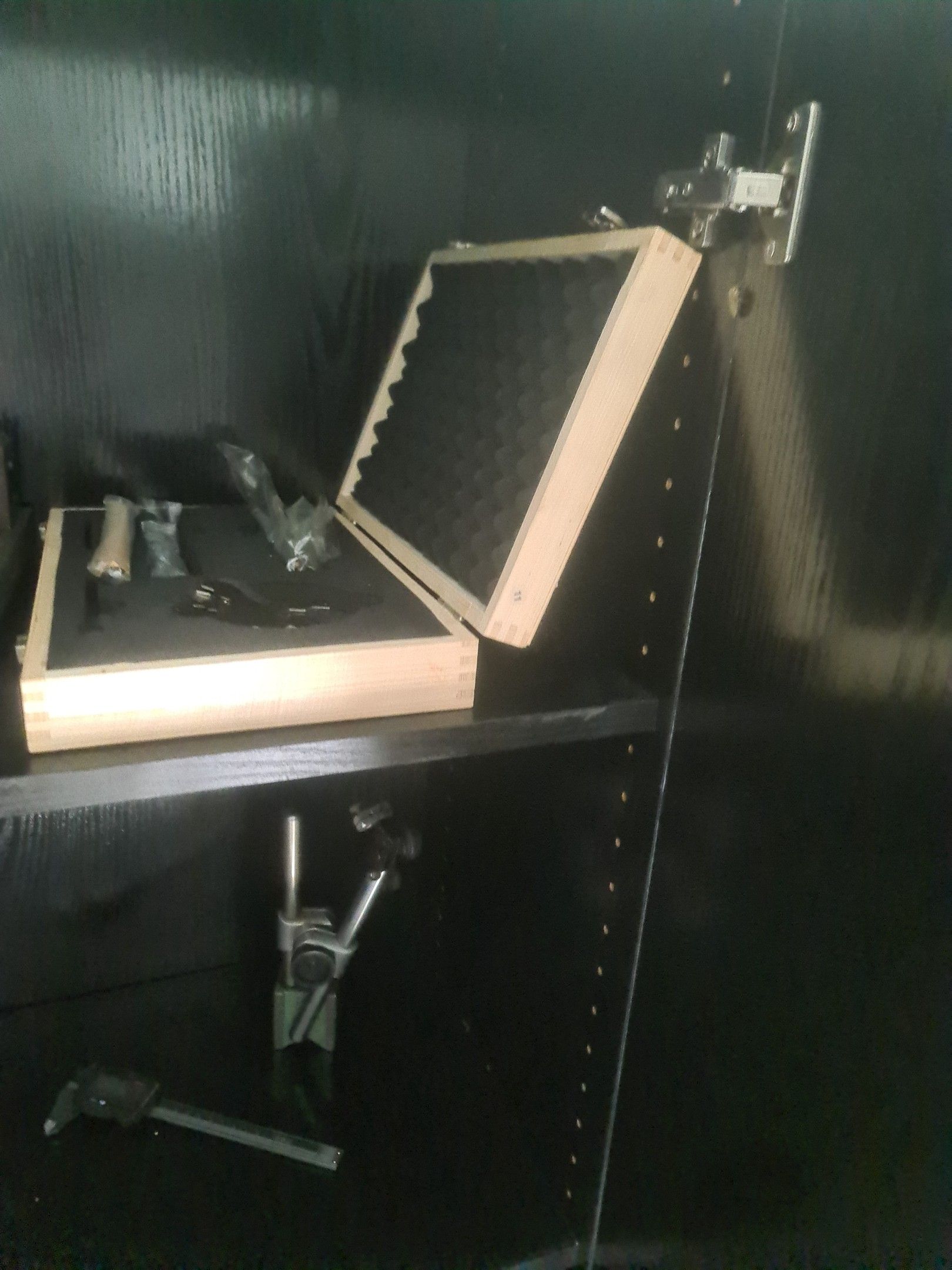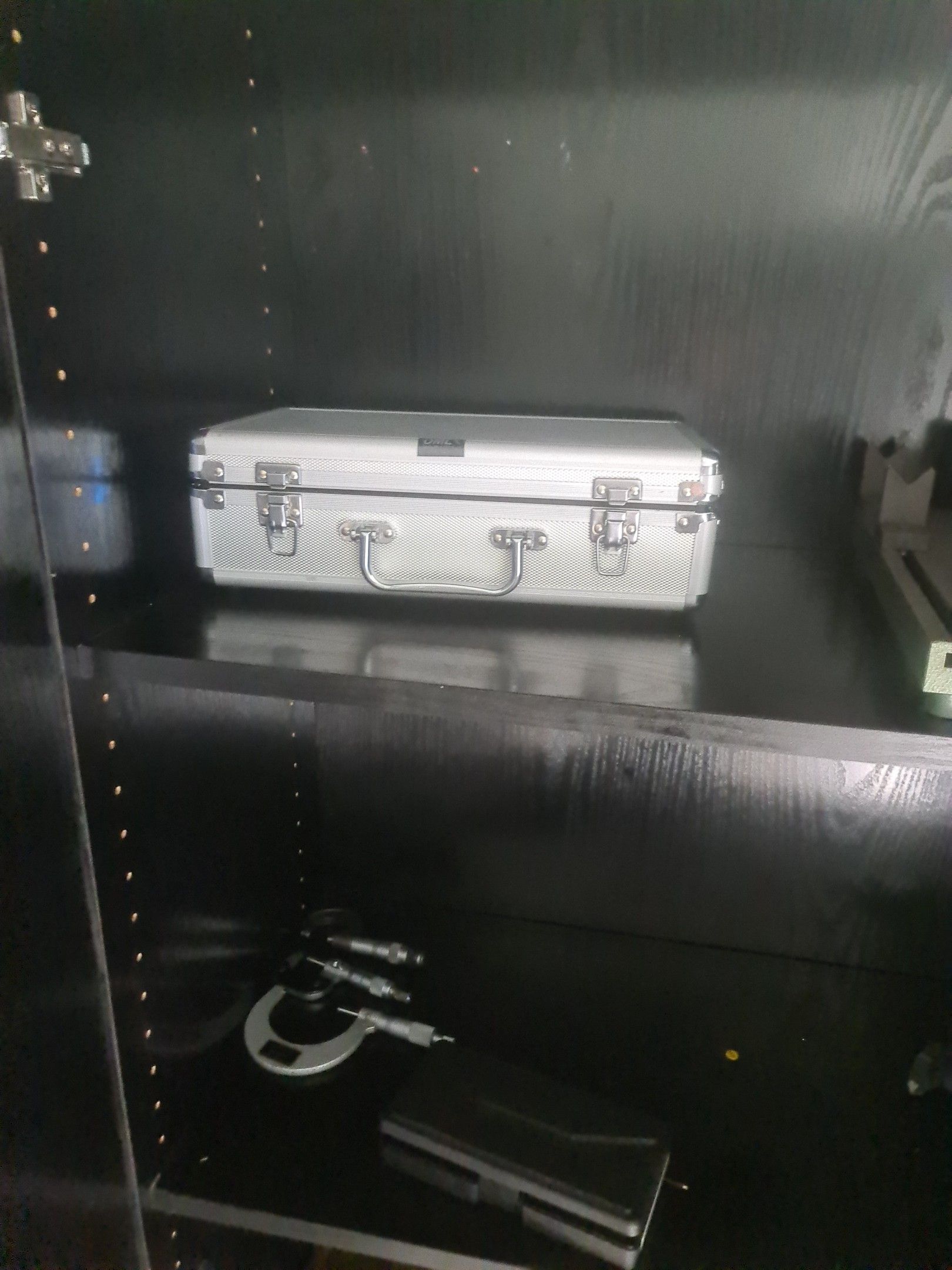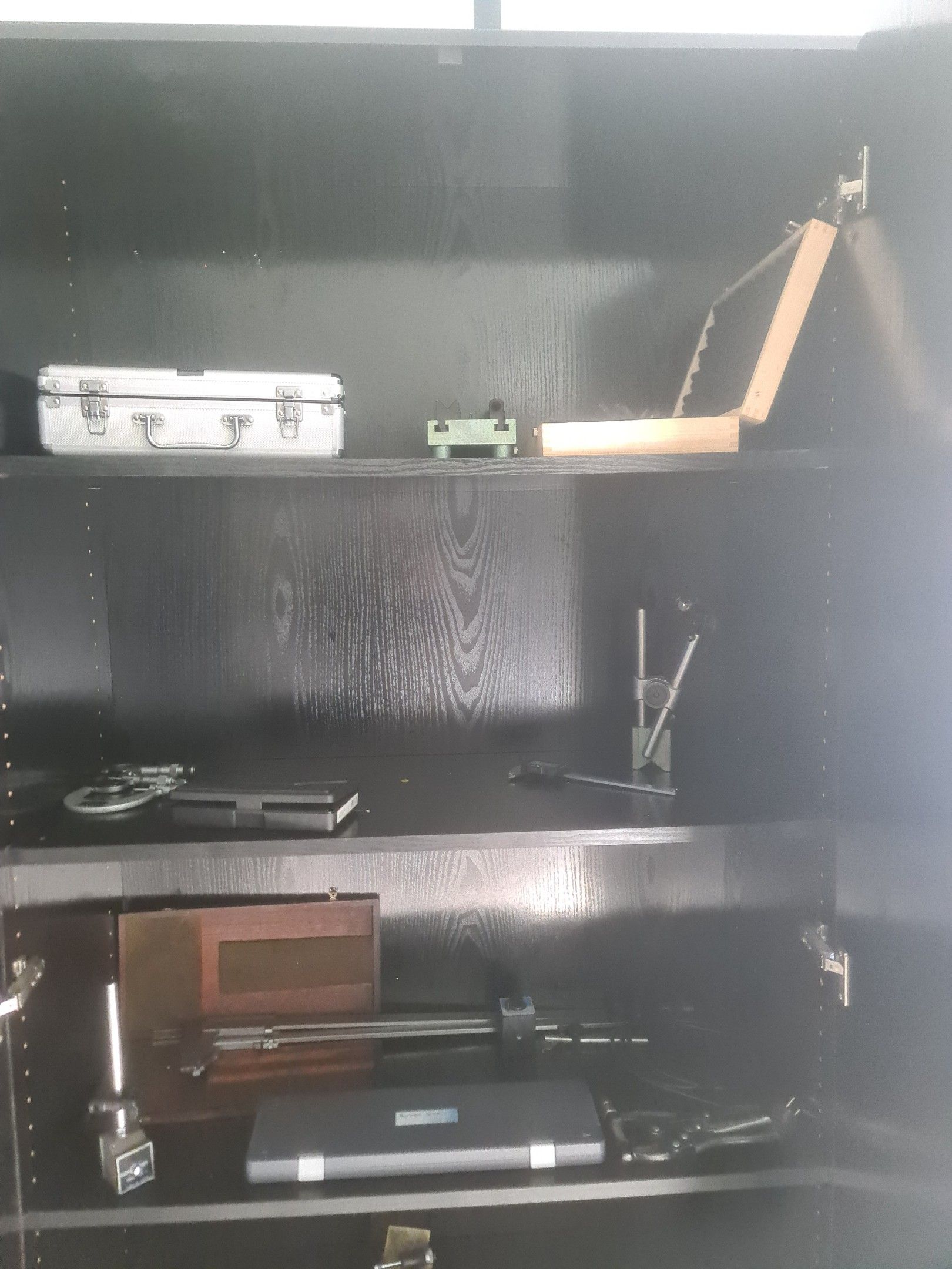 grey and blue metal cloakroom with six lockers, metal cloakroom, column, two lockers, grey metal cupboard, black laminated cupboard with glazed bookcase section
