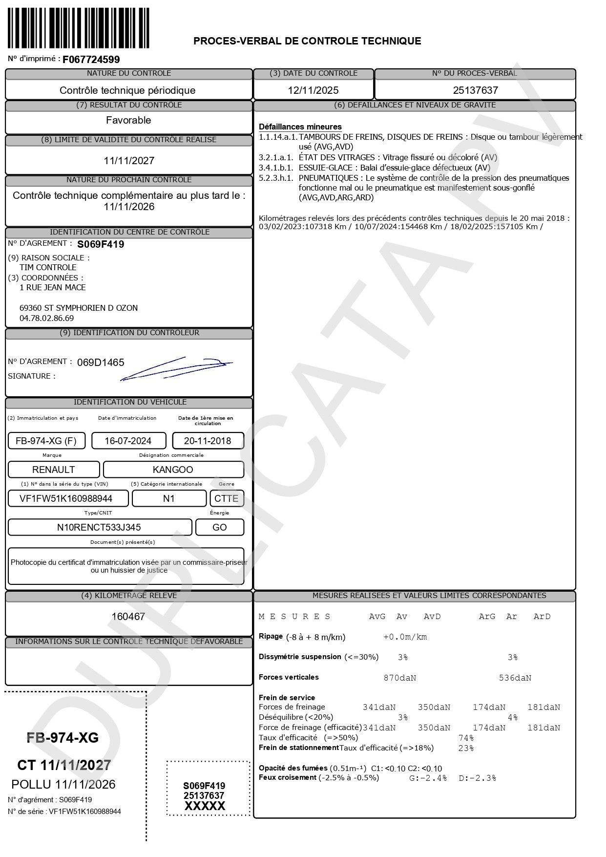 FB974XG RENAULT KANGOO CTTE FOURGON GO 05 CV 3 places, date of 1st registration on the administrative document of 20/11/2018, sold with FIV, 160457 km, 2 keys, scratches and shocks, legal fees 14.28%, VAT RECOVERABLE