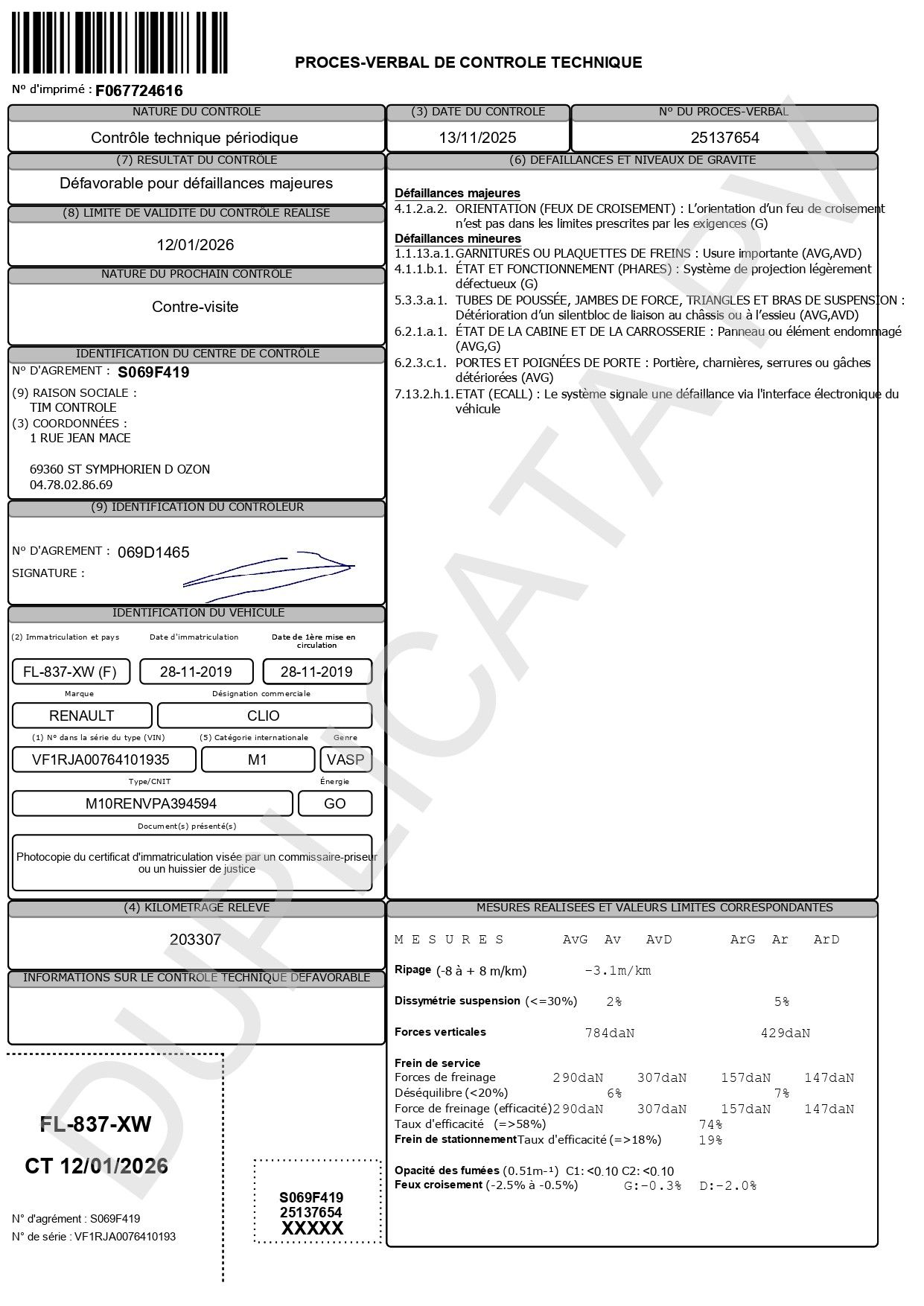 FL837XW RENAULT CLIO VASP DERIV VP GO 04 CV, date of 1st French registration on the CG of 28/11/2019, 203297 km on the clock, 2 keys, scratches and bumps, shock left wing and front light, antenna missing, voluntary sale at the request of the financing body, voluntary fee 18%+360e