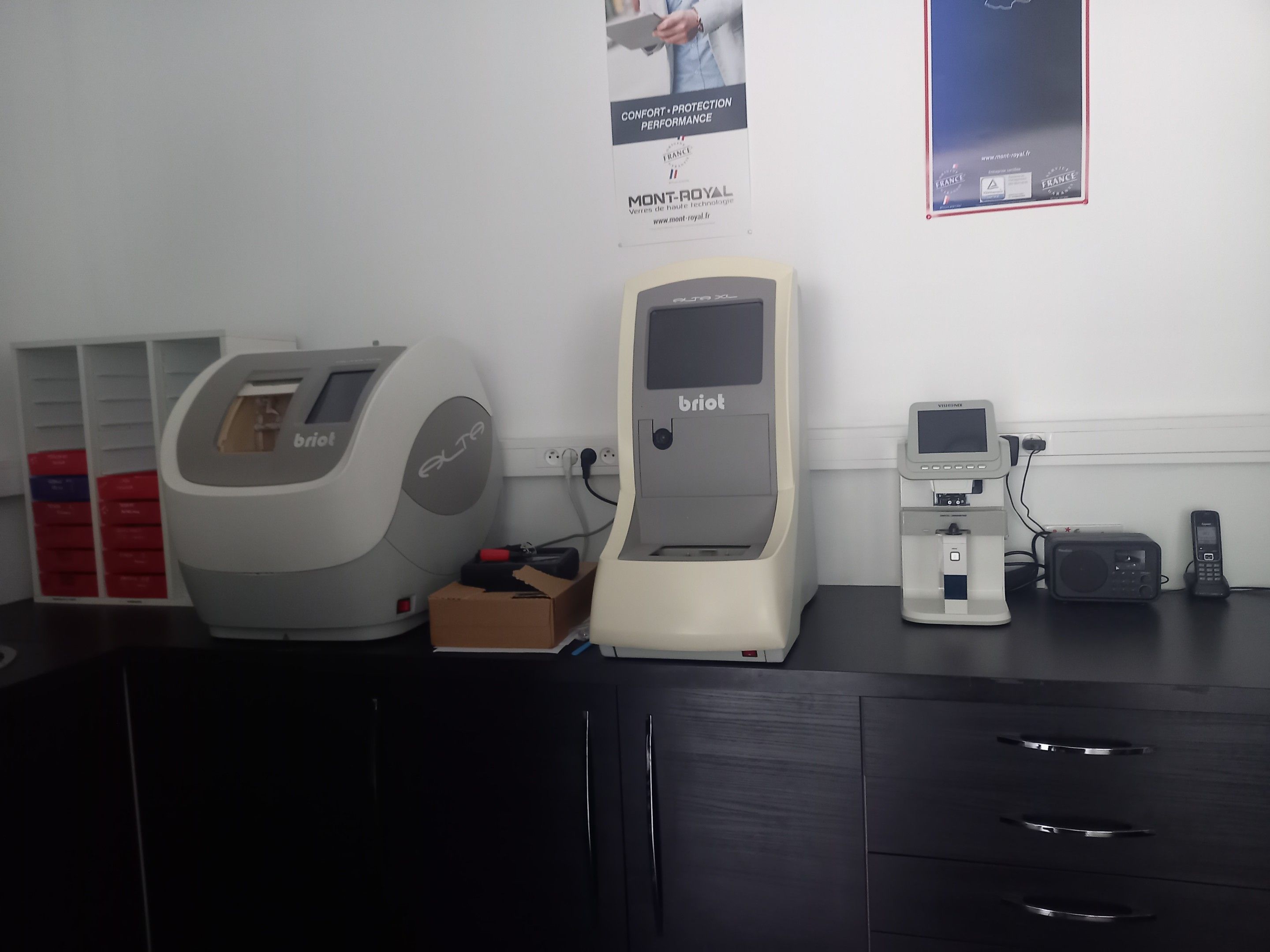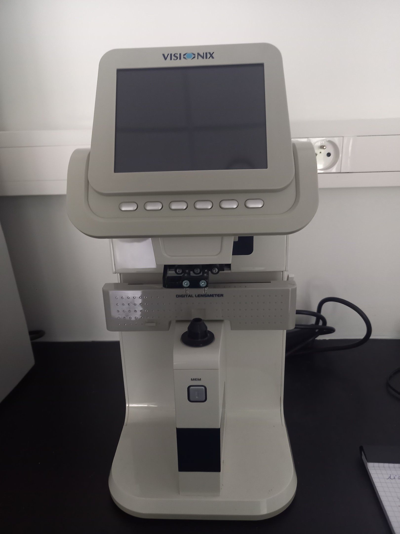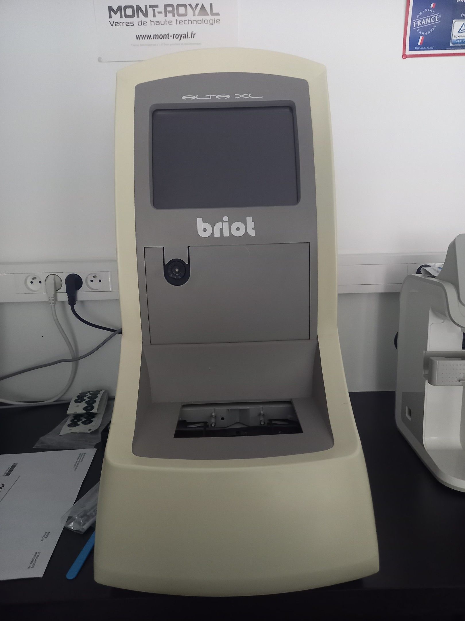 Frontofocometer VISIONIX DIGITAL LENSMETER (about 10 years old), Assembly line with grinder and centring machine ALTA XL BRIOT (year about 2009), Hand grinder TEAGEANCER AC 220 V 240 V 50/60 Hz, Various screws and clamps of different diameters, Blue ultrasonic tank ELMA S10 ELMASONIC, Chaufferette MAGAS, Lampe de bureau noir (Matériel ancien environ 10 ans) (Suite Liquidation Judiciaire GJB OPTICIENS / ALLIANCE MJ en date du 07/10/2025) (Exhibition on Tuesday 25 from 16 Heures to 16 Heures 30 au ZA de Verlieu, CC Leclerc, 42410 CHAVANAY)