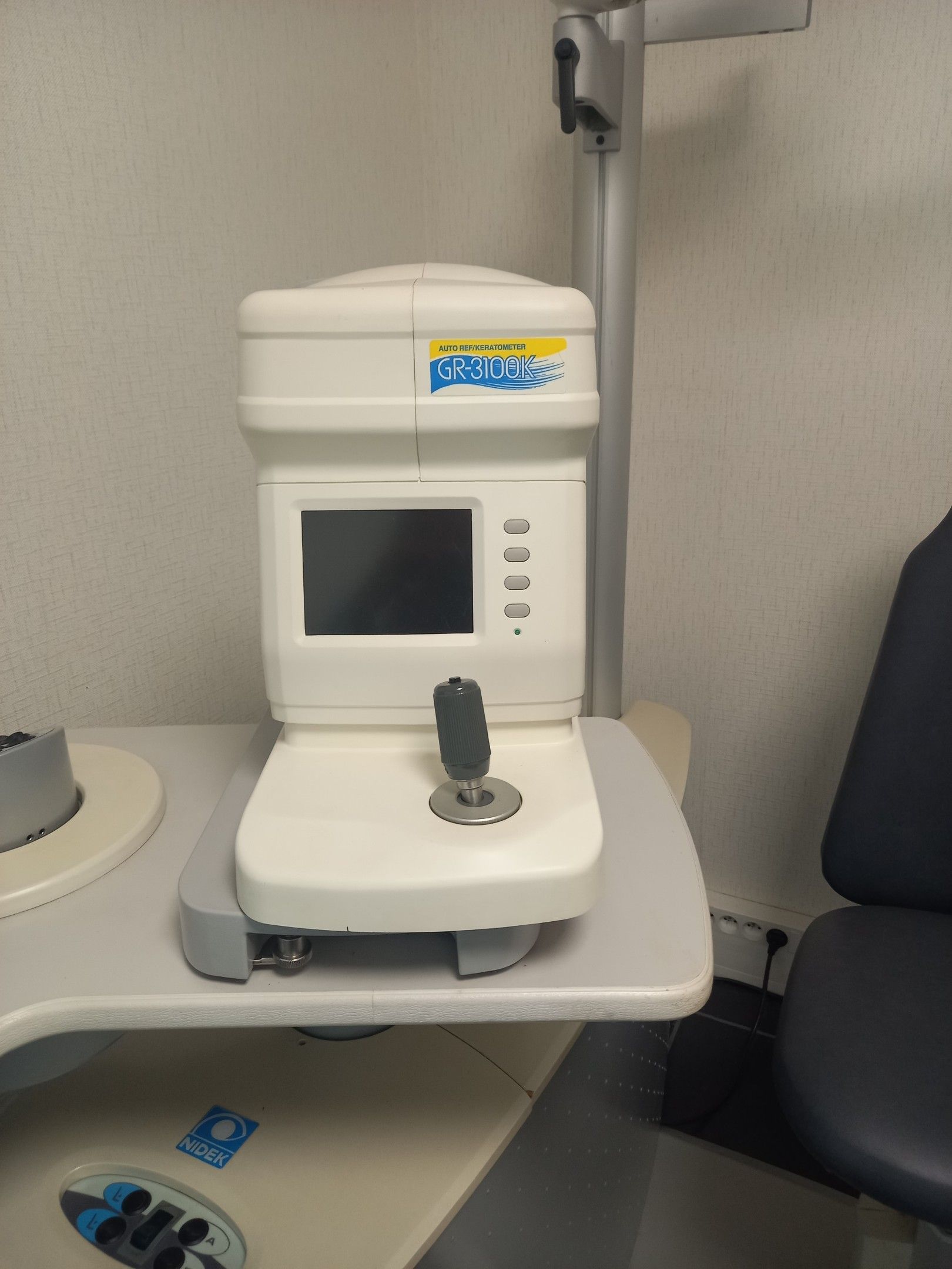 OPTICIAN'S EQUIPMENT Eye examination table with NIDELL SL 250 forehead lamp, Auto Ref/Keratometer (sight and curvature of the eye), Lamp, NIDEK RT 600 head (broken shaft), Test case