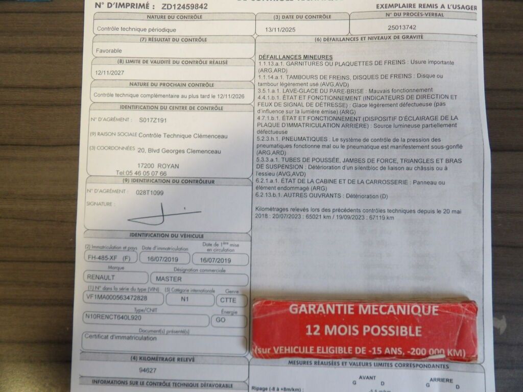 RENAULT MASTER 2.3 DCI 110CV CONFORT L1H1 - Type : CTTE - Body : FOURGON - Energy : GO - Color : BLEU - Mileage : 94630 - 1ere M.E.C : 16/07/2019 - Power : 8 - Tva récupérable - Type mines : N10RENCT640L920 - Seats : 3 - Length : 505 - Width : 207 - Height : 229 - Remarks : LINE 3 - 215 - Equipment : ELECTRIC WINDOWS / CAB SEPARATION / CENTRAL LOCKING / MECHANICAL WARRANTY POSSIBLE / 6-SPEED GEARBOX / WOOD FLOOR / THREE SEATS / RADIO / WOOD TRIM / SIDE DOOR / MAINTENANCE REQUIRED / RADIO CODE MISSING / ELECTRIC MIRRORS / AIR BAGS / BLUETOOTH / RECOVERABLE VAT