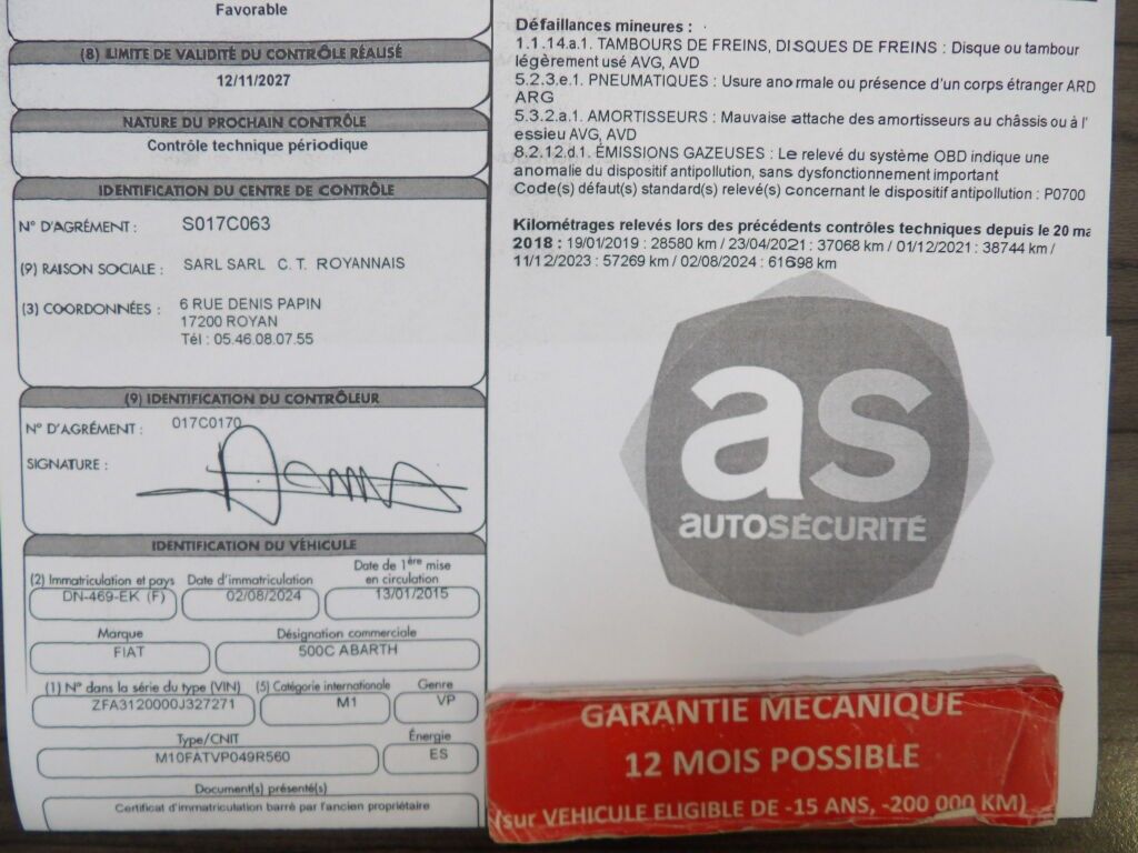 FIAT ABARTH 500 C 1.4 TURBO 16V T-JET140CH A - Type: MPV - Body: CI - Energy: ES - Color: GRIS - Mileage: 66088 - 1ere M.E.C: 13/01/2015 - Power: 8 - Type mines: M10FATVP049R560 - Seats: 4 - Length: 366 - Width: 163 - Height: 149 - Remarks : LIGNE 7 - 93 - Equipment : PREVOIR ENTRETIEN / QUELQUES FACTURES / ADHÉSION POSSIBLE A LA GARANTIE MECANIQUE / JANTES ALU / CUIR / BOITE AUTOMATIQUE / PALETTES AU VOLANT / ORDINATEUR DE BORD / FEUX ANTI-BROUILLARD AV / FERMETURE CENTRALISEE / VITRES ELECTRIQUES / RETROS ELECTRIQUES / AIR BAGS / CLIM AUTOMATIQUE / RADAR DE RECUL / CAMERA DE RECUL
