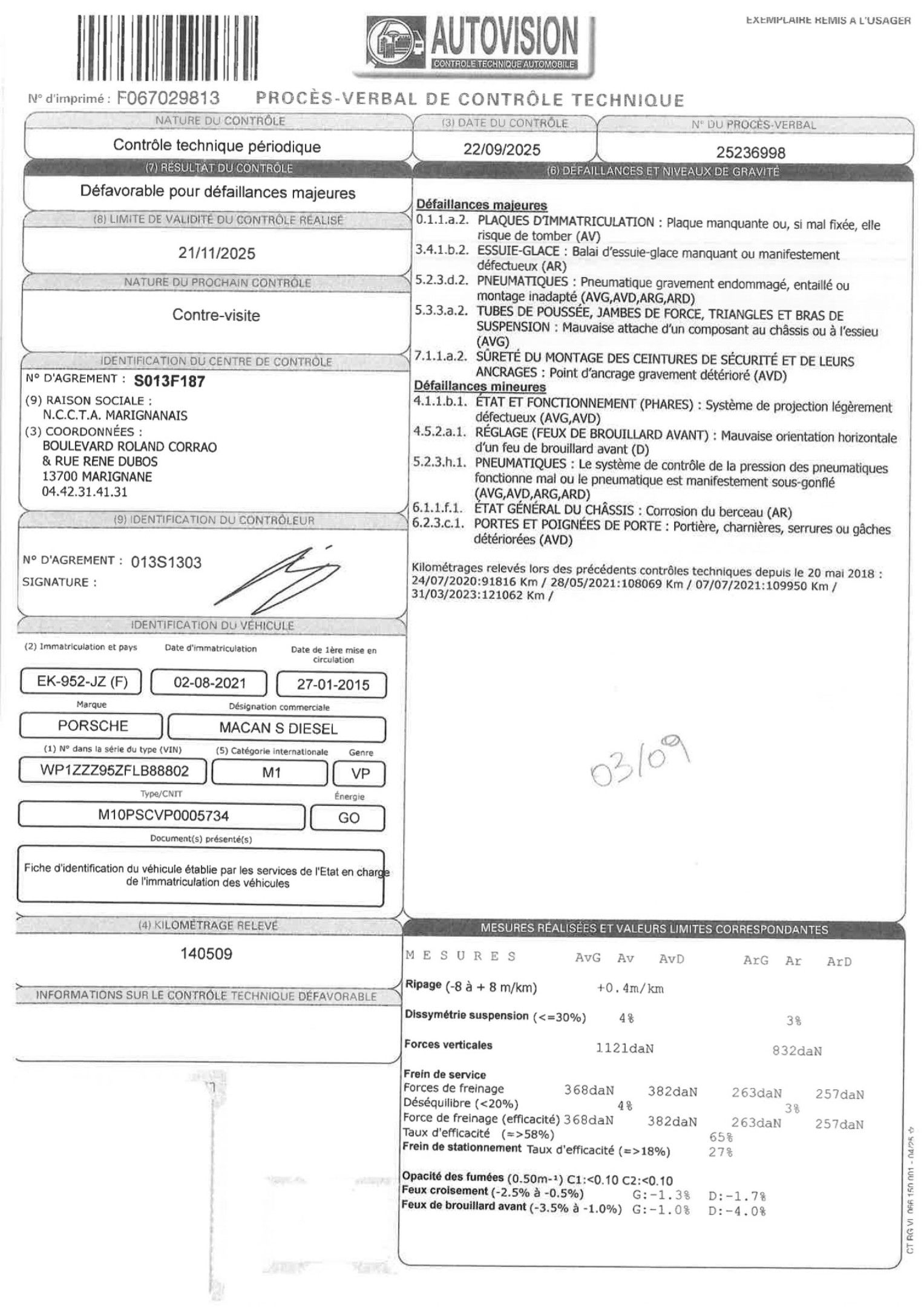 PORSCHE MACAN DIESEL 3.0 V6 258CH PDK - Type : VP - Body : BREAK - Energy : GO - Mileage : 140494 - 1ere M.E.C : 27/01/2015 - Power : 16 - Mine type : M10PSCVP0005734 - Remarks : VENDU AVEC FICHE D'IDENTIFICATION, DOCUMENT NON VALABLE POUR L'EXPORTATION, BATTERIE HORS SERVICE - Equipements : BOITE AUTO