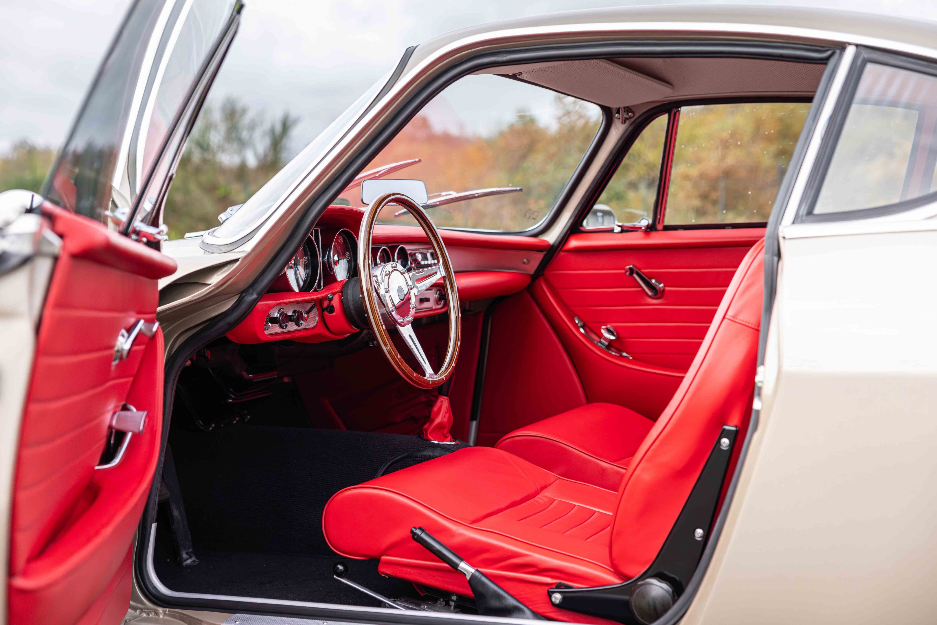 Magnificent in its Opalescent Golden Sand exterior hue, borrowed from Jaguar’s 1960s colour range, it highlights the sculptural lines of the body with grace and refinement. Inside, the red leather upholstery beautifully complements the dashboard, whose full set of instruments remains perfectly functional. True perfection lies in the details: the specially fitted wire wheels complete the harmony of the whole, giving the car an allure worthy of the finest British and Italian creations.