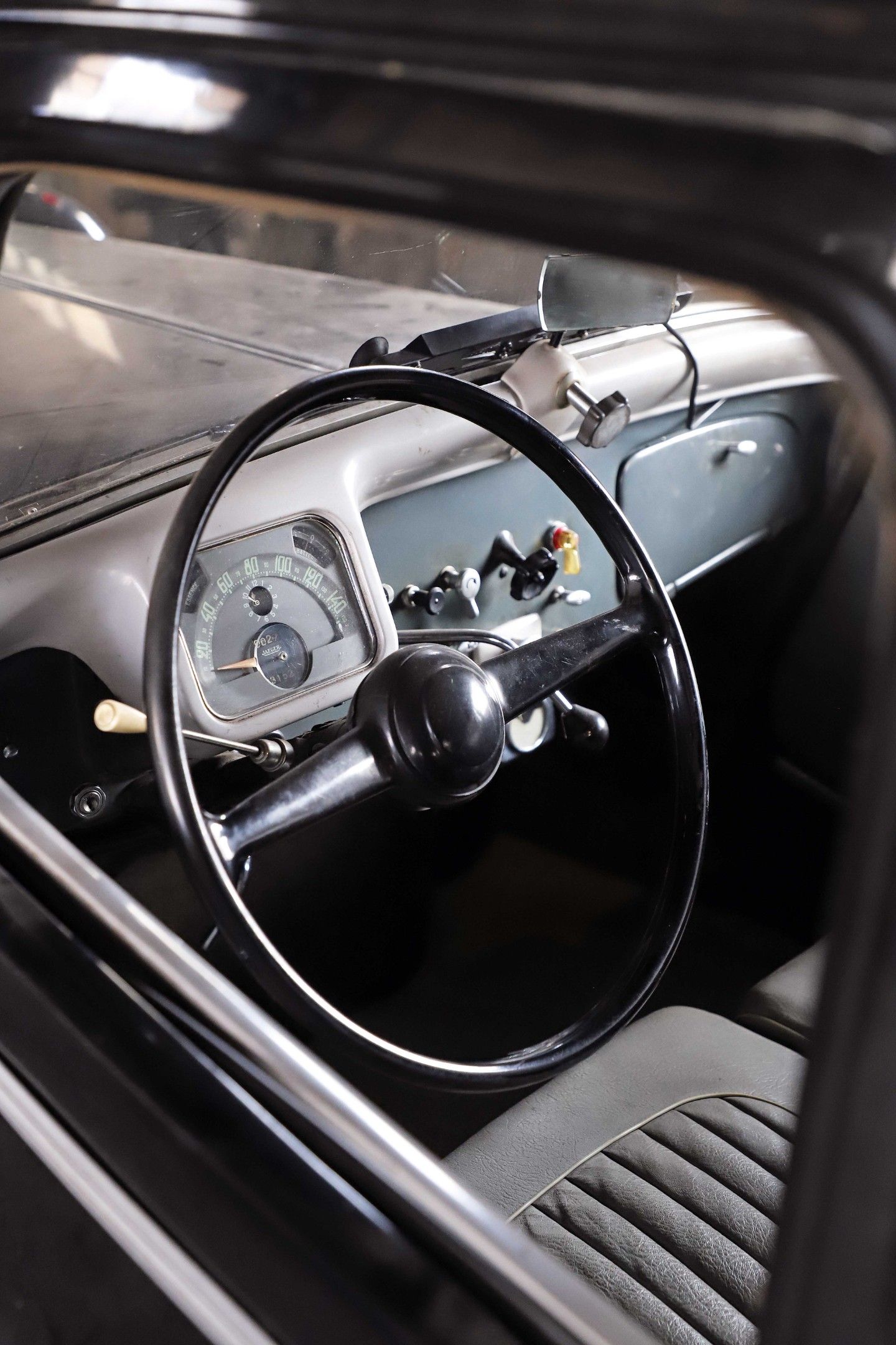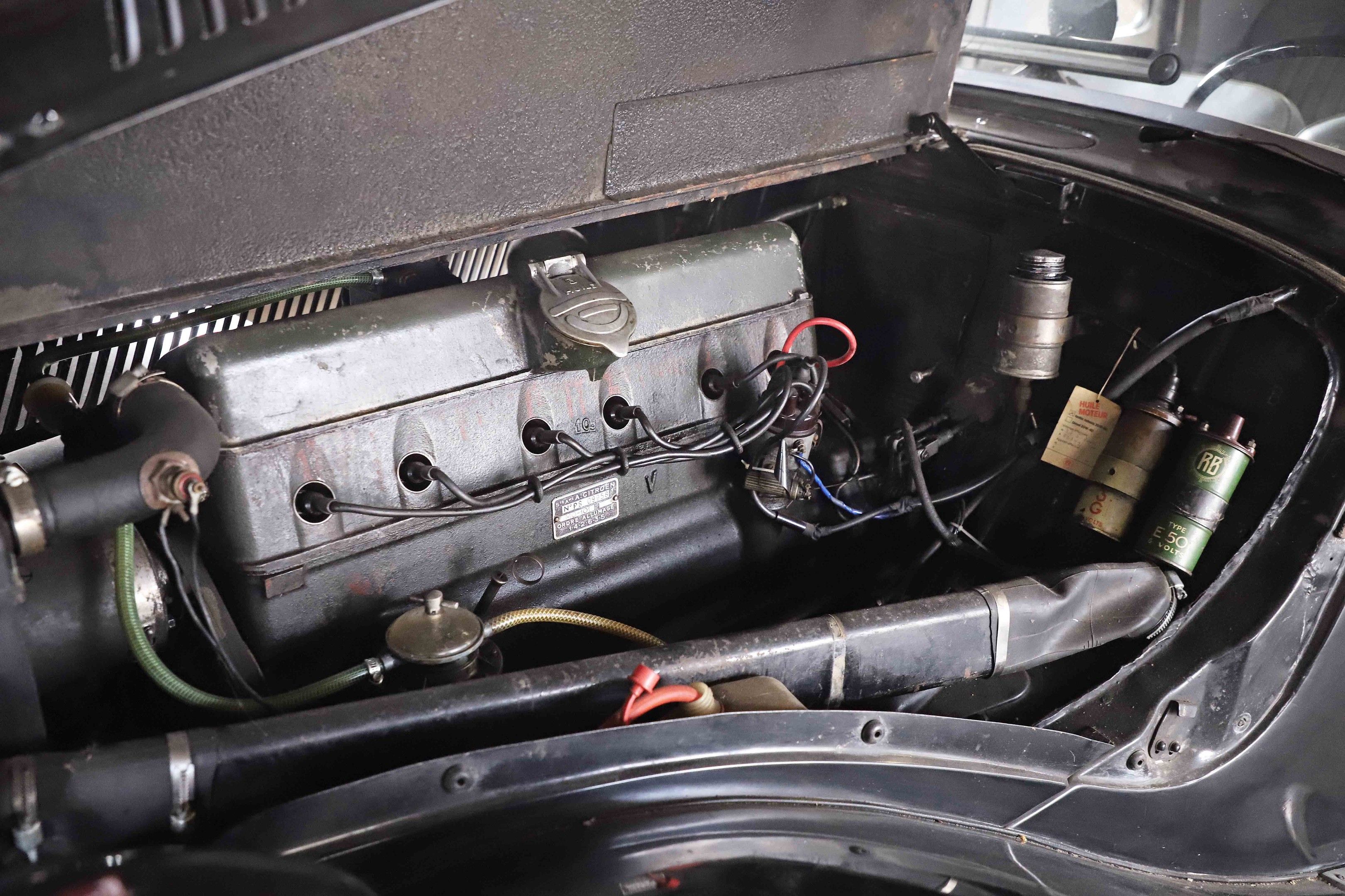 - Son kilométrage de 83 000 km semble également cohérent avec l’état de la voiture et l’usure qu’elle présente. De couleur noire avec un en skaï gris, elle se présente dans sa configuration originelle. En bon état général, elle semble saine, complète et d’origine, attendant une remise en route a priori facile.