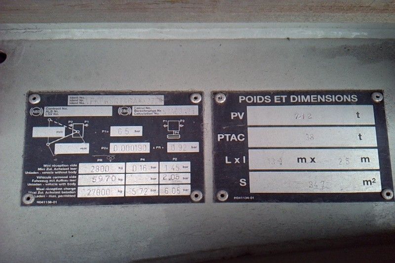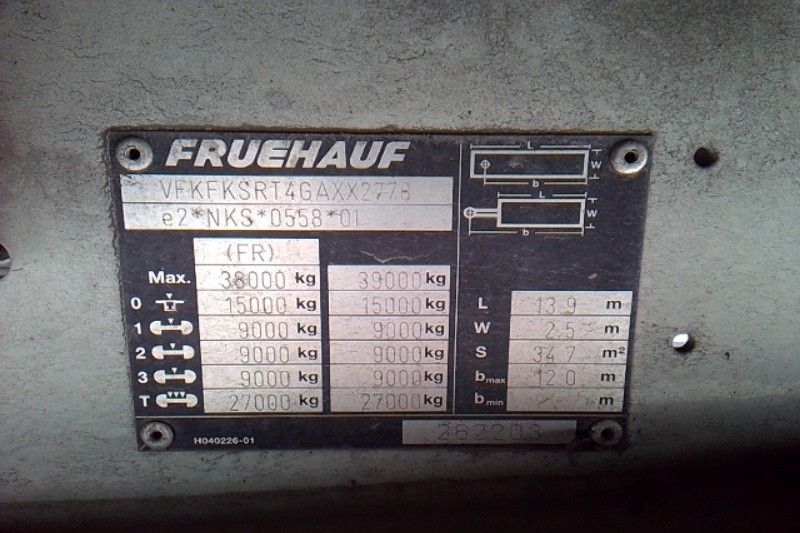 SREM FRUEHAUF SEMI REMORQUE BACHE HAYON 3 ESSIEUX PTAC 38T - Dmec : 05/04/2017-1Kms-Carrosserie : PLSC-Energie : NC-Couleur : GRIS-TVA récupérable-Equipements : HAYON DHOLLANDIA CAPACITE 2T/BACHE/3 ESSIEUX/PTAC 38T/FERMETURE PORTE AR D A VOIR/AVEC VGP HAYON OK/