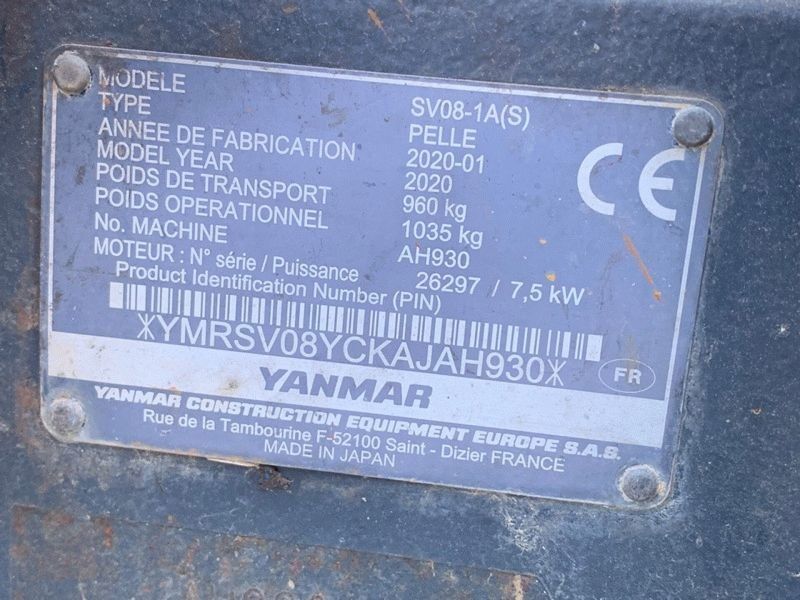 TP YANMAR MICROPELLE SV08-1A(S) A VOIE VARIABLE SUR CHENILLES DIESEL 1T - 1306 HEURES-Energie : GO-TVA récupérable-Equipements : VGP OK/FONCTIONNE/HORAMETRE : 1306 HEURES/EQUIPE D'UN GODET DE CURAGE 800MM/ET 2 GODETS RETRO 390/280MM ET 200/280MM/FOURNI AVEC CERTIFICAT CE UNIQUEMENT/VIDEO :/https://youtu.be/O2c7q3iJrzk/