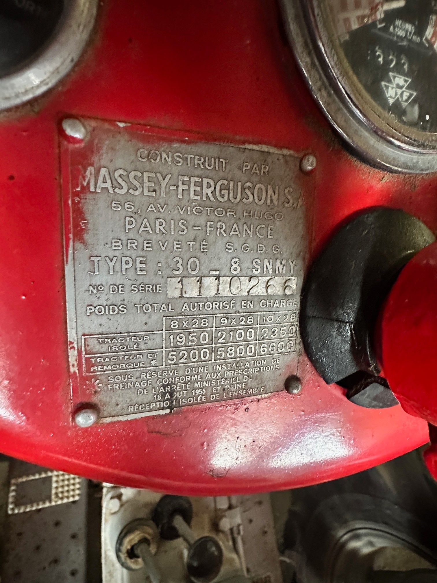 TRA MASSEY FERGUSON type 30-8 SNMY - avec carte grise - immat HD-442-SE - N° série 1110266 - DMEC CG 11/1964 ***vente suite à succession de Mr F. importante collection de tracteurs agricoles anciens - véhicules pour la plupart restaurés et fonctionnels du vivant du collectionneur - n'ont pas tourné au moins depuis 12 mois - vendus en l'état sans réclamation - révision - remise en route ou restauration pour certains sont à prévoir à charge des acquéreurs - vente sur désignation à retirer en Lozère proche Autoroute A 75 - enlèvement sur présentation de la facture le lundi 8 décembre à partir de 9H - frais 24% - réf 32807 ***