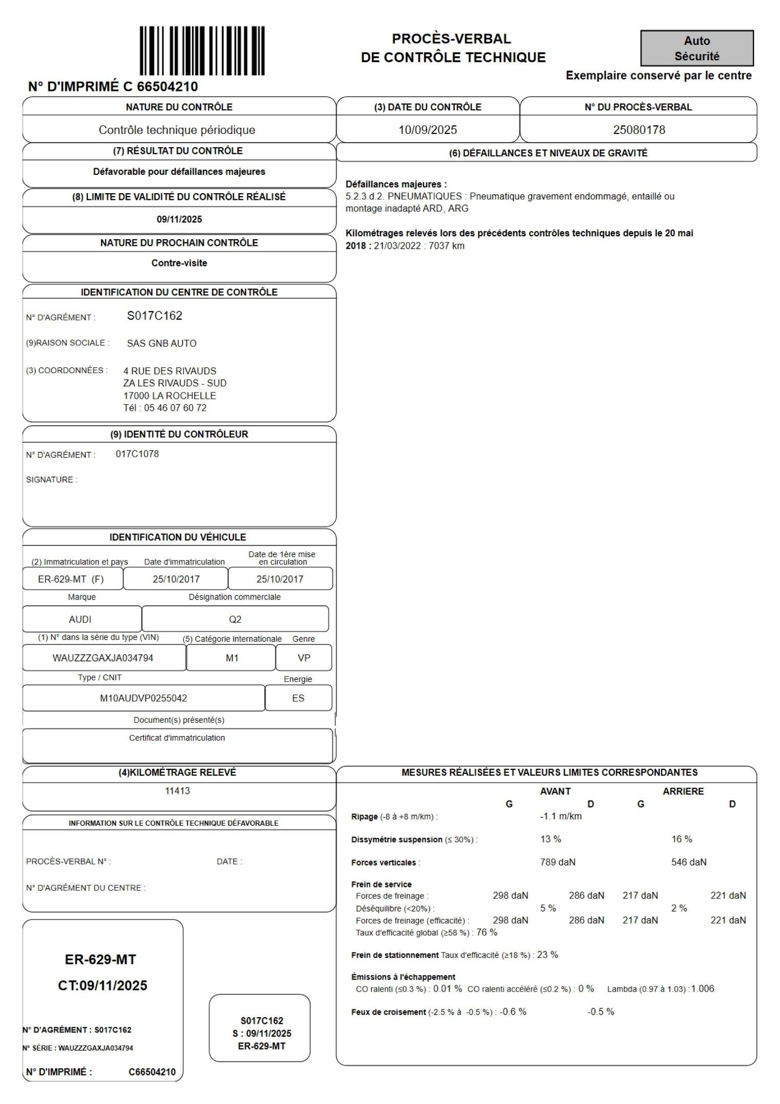 Contrôle technique en pièce jointe (valididité dépassée), charge à l'acquéreur de le refaire pour réimmatriculer le véhicule