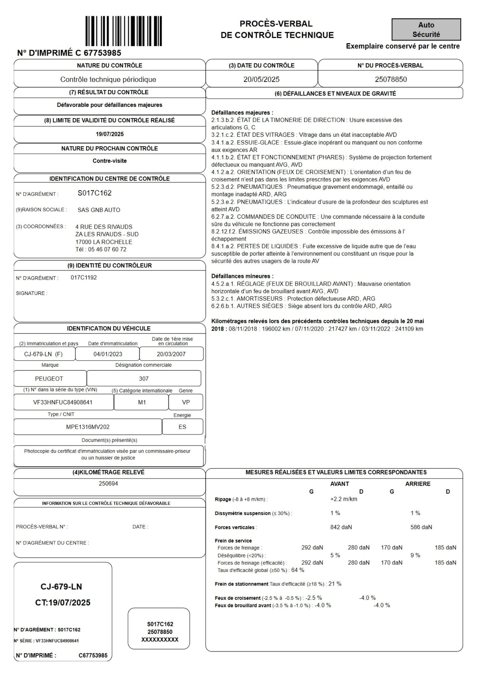 Peugeot 307 BREAK SW CJ-679-LN 1ère MEC : 20/03/2007 VF33HNFUC84908641 Kilométrage : 250 674 km Essence Toit ouvrant panoramique Batterie déchargée CT valable jusqu'au 19 juillet 2025 en pièce jointe (charge à l'acquéreur de le refaire pour la ré immatriculation) Nota : fiche d'identification véhicule pour l'immatriculation