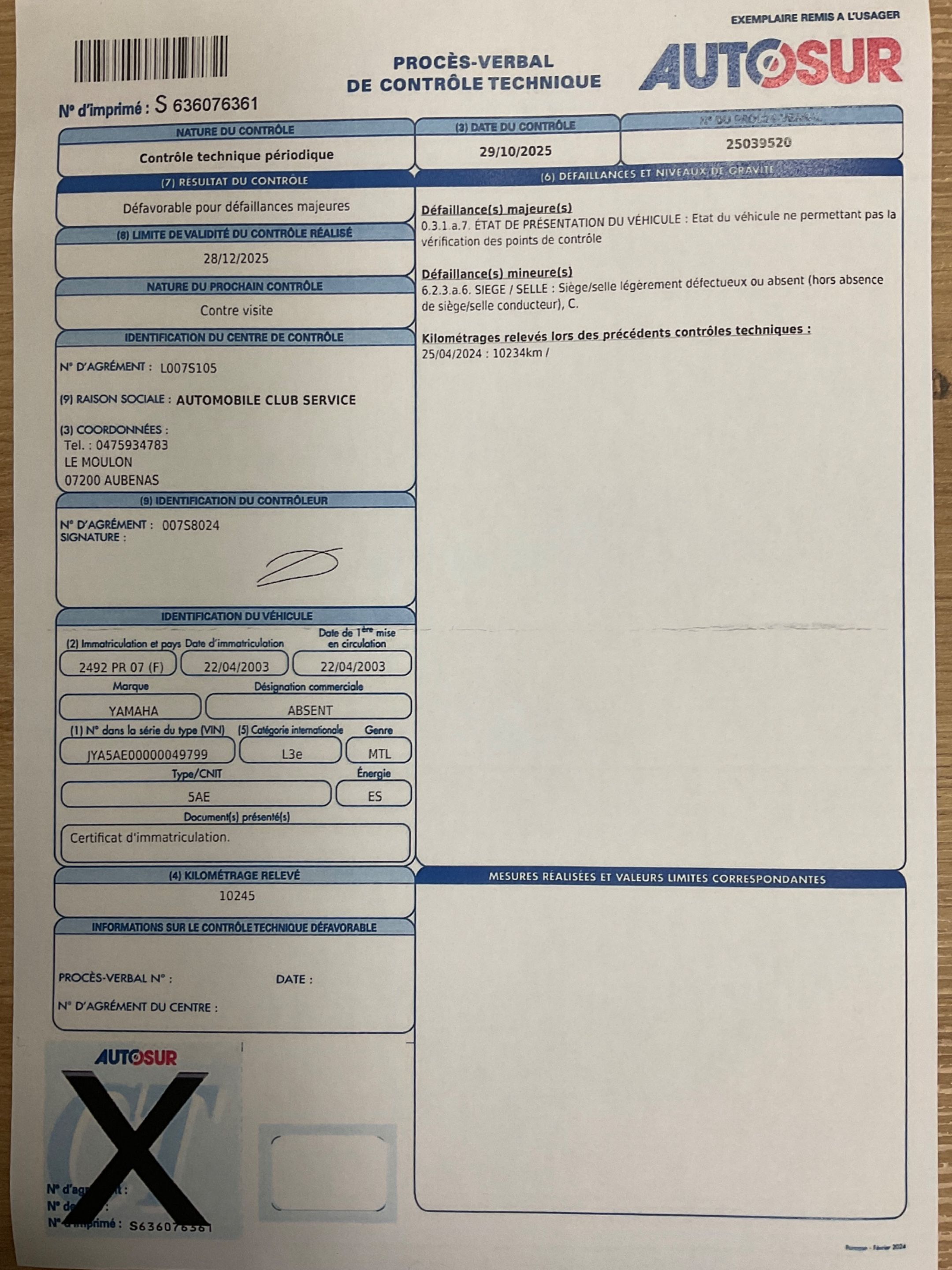 CONTROLE TECHNIQUE DEFAVORABLE.