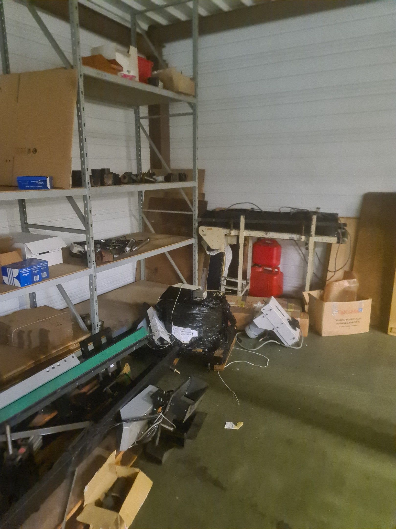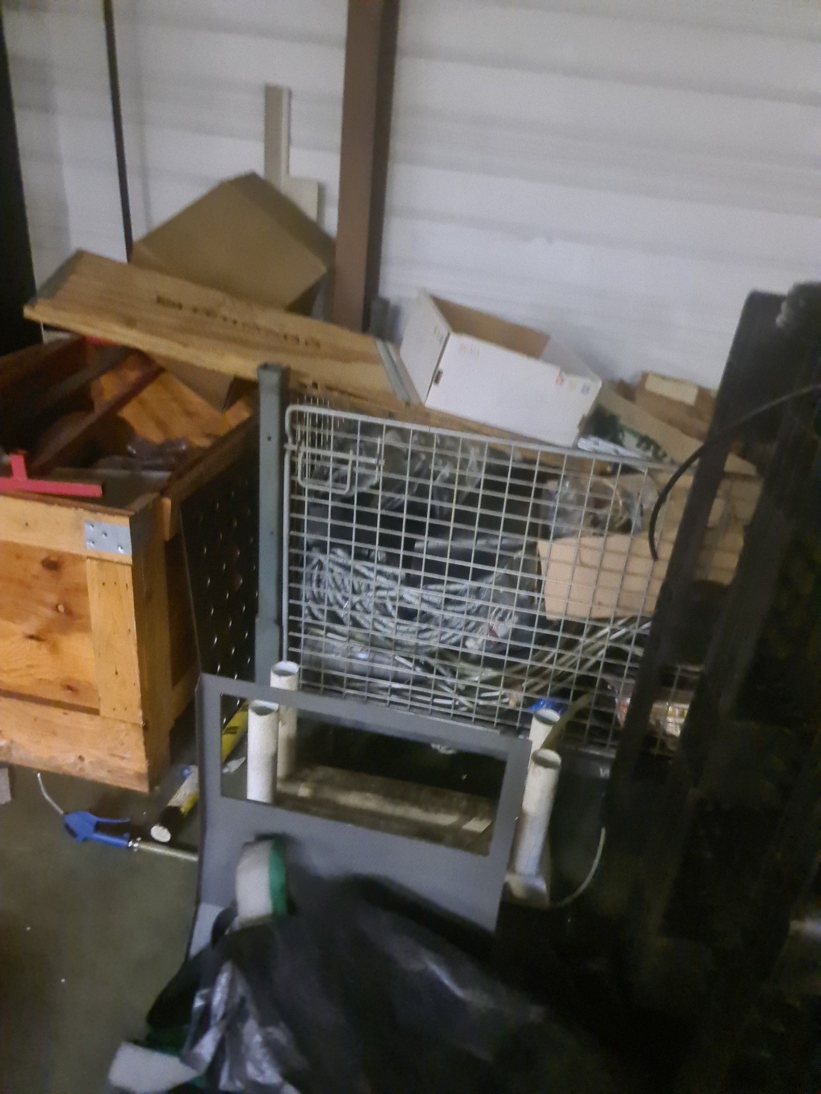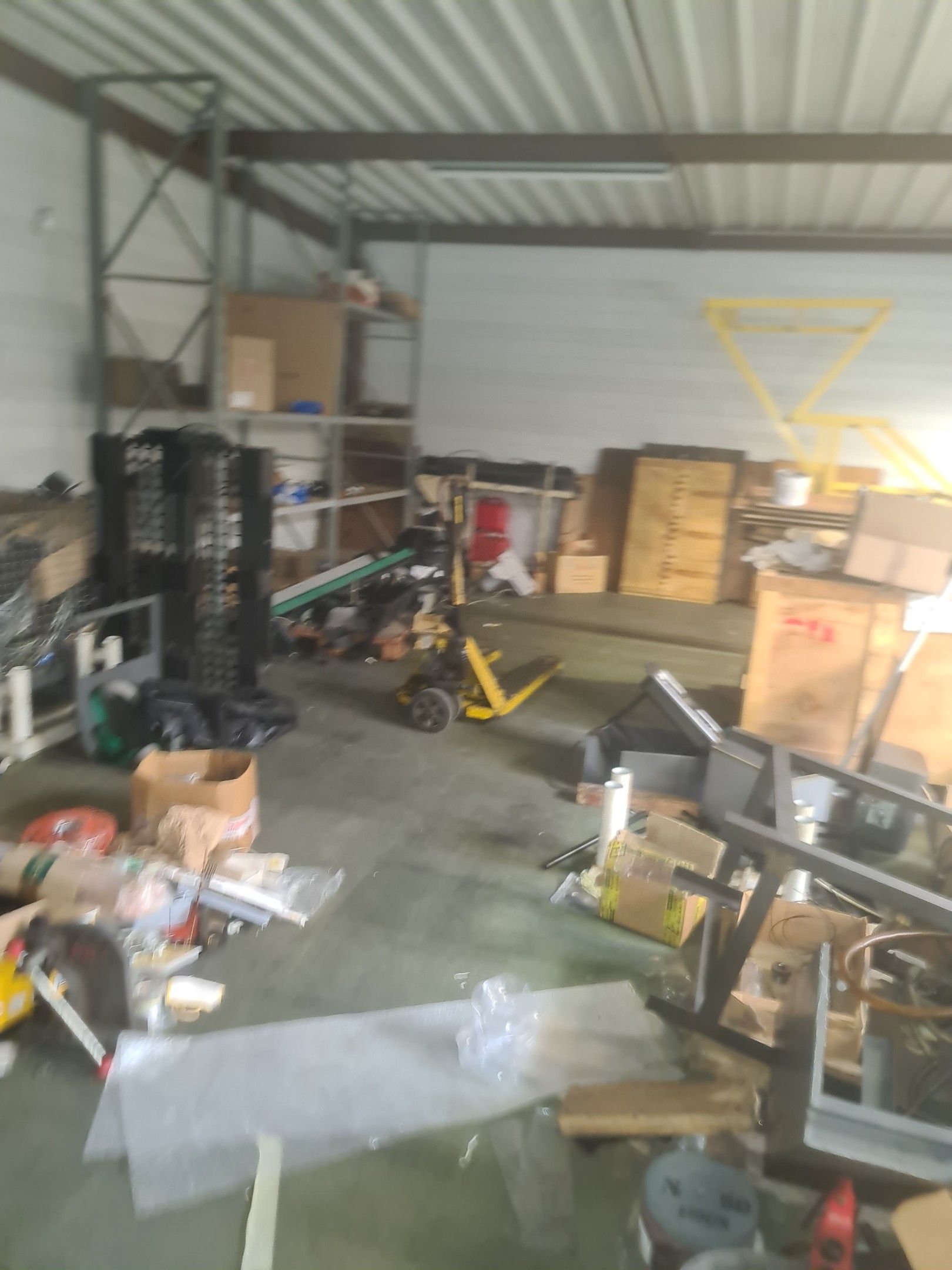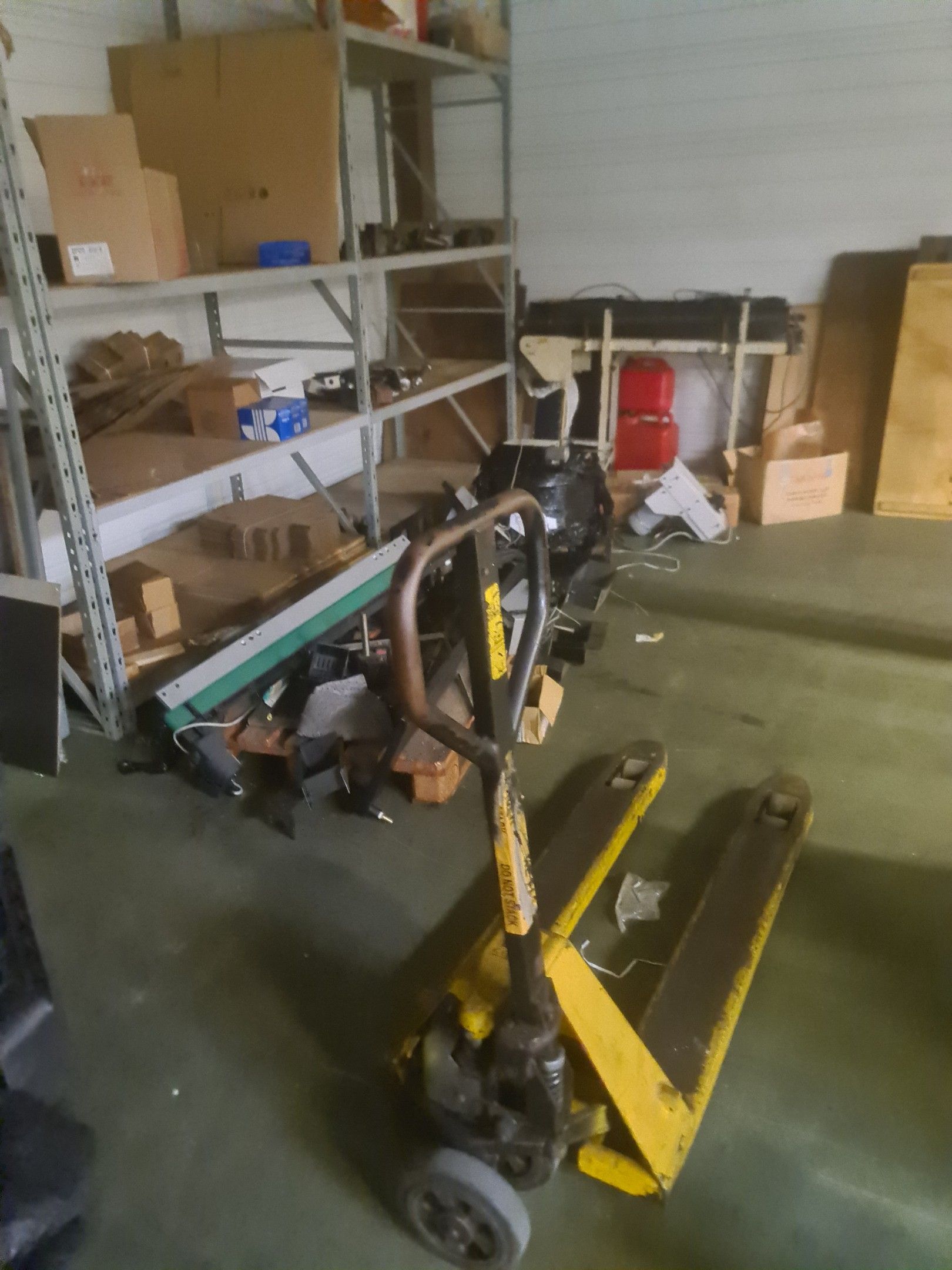 un transpalette manuel métallique jaune, un convoyeur à bande motorisé, un vestiaire métalliques gris deux casiers, une armoire métallique, balance de caisse hors service, aspirateur Karcher WD6P, pièces détachées