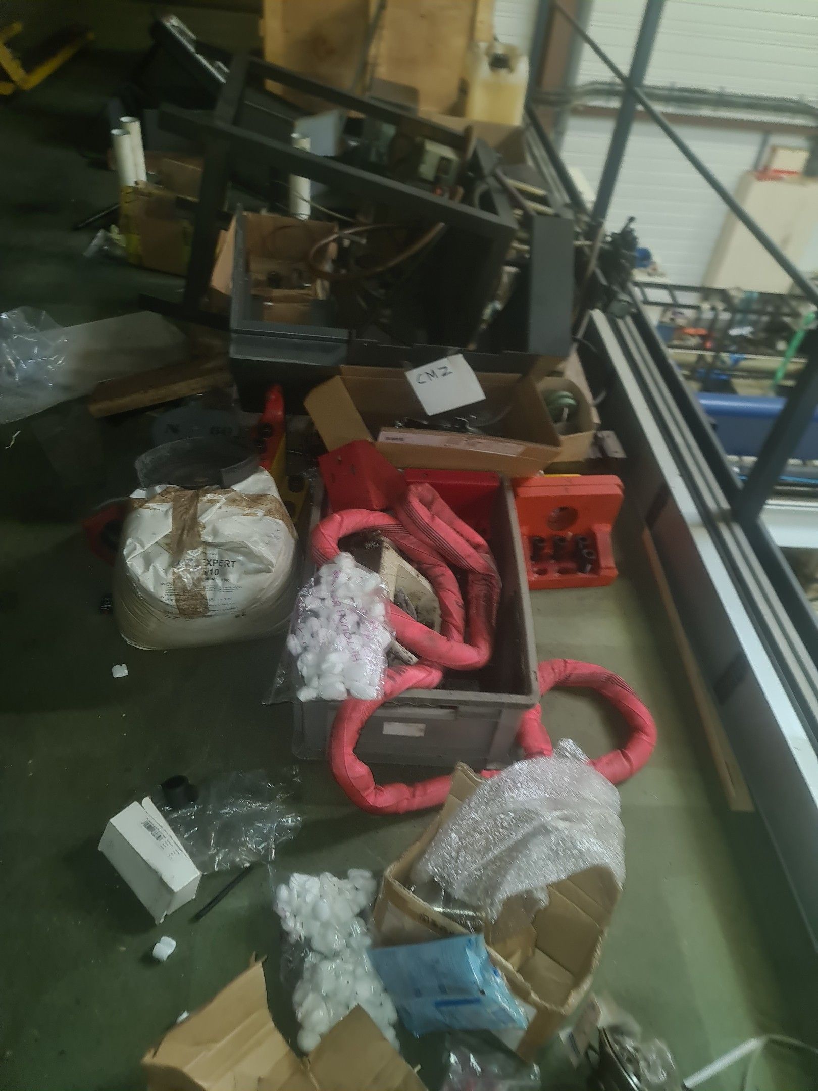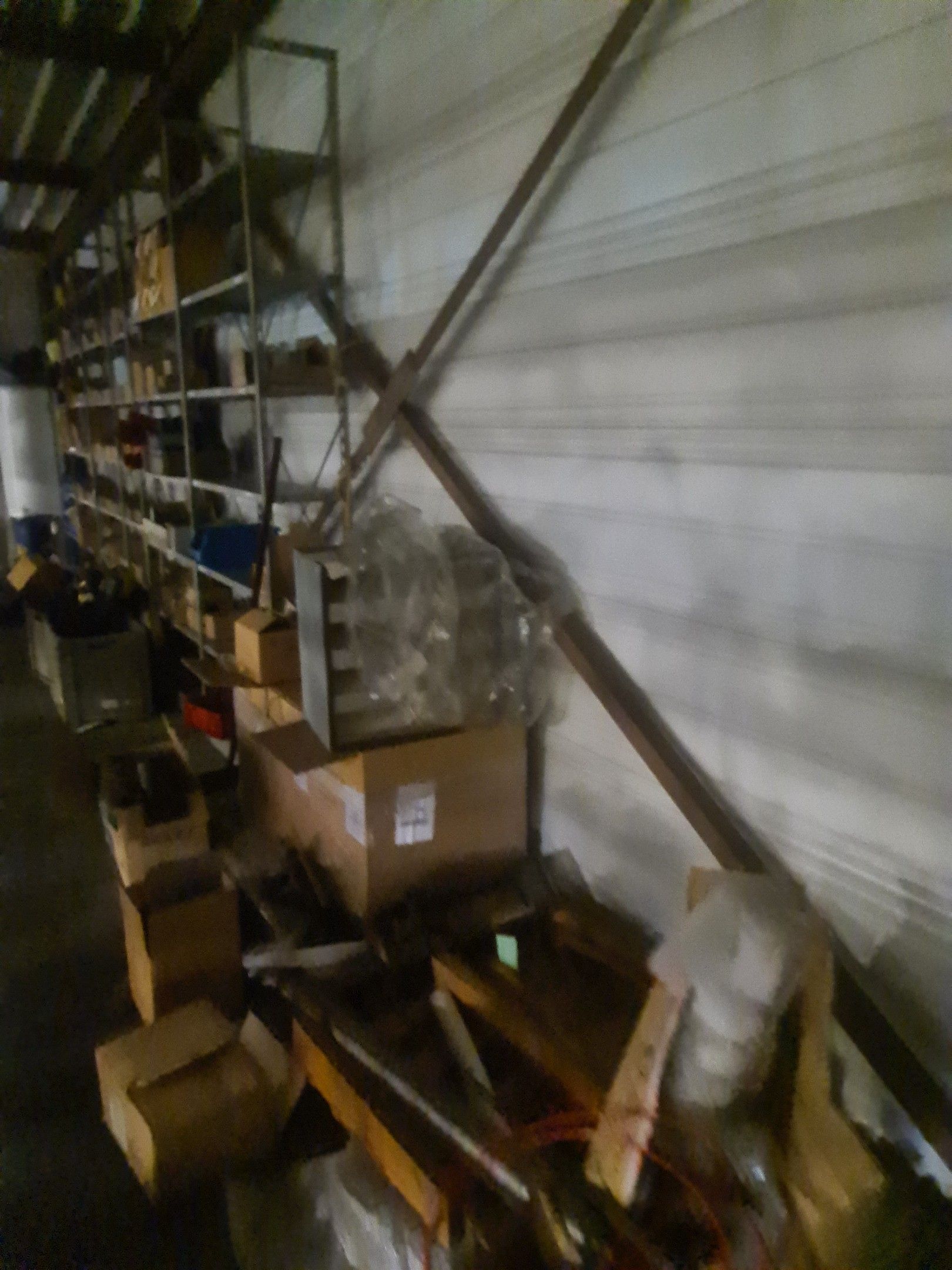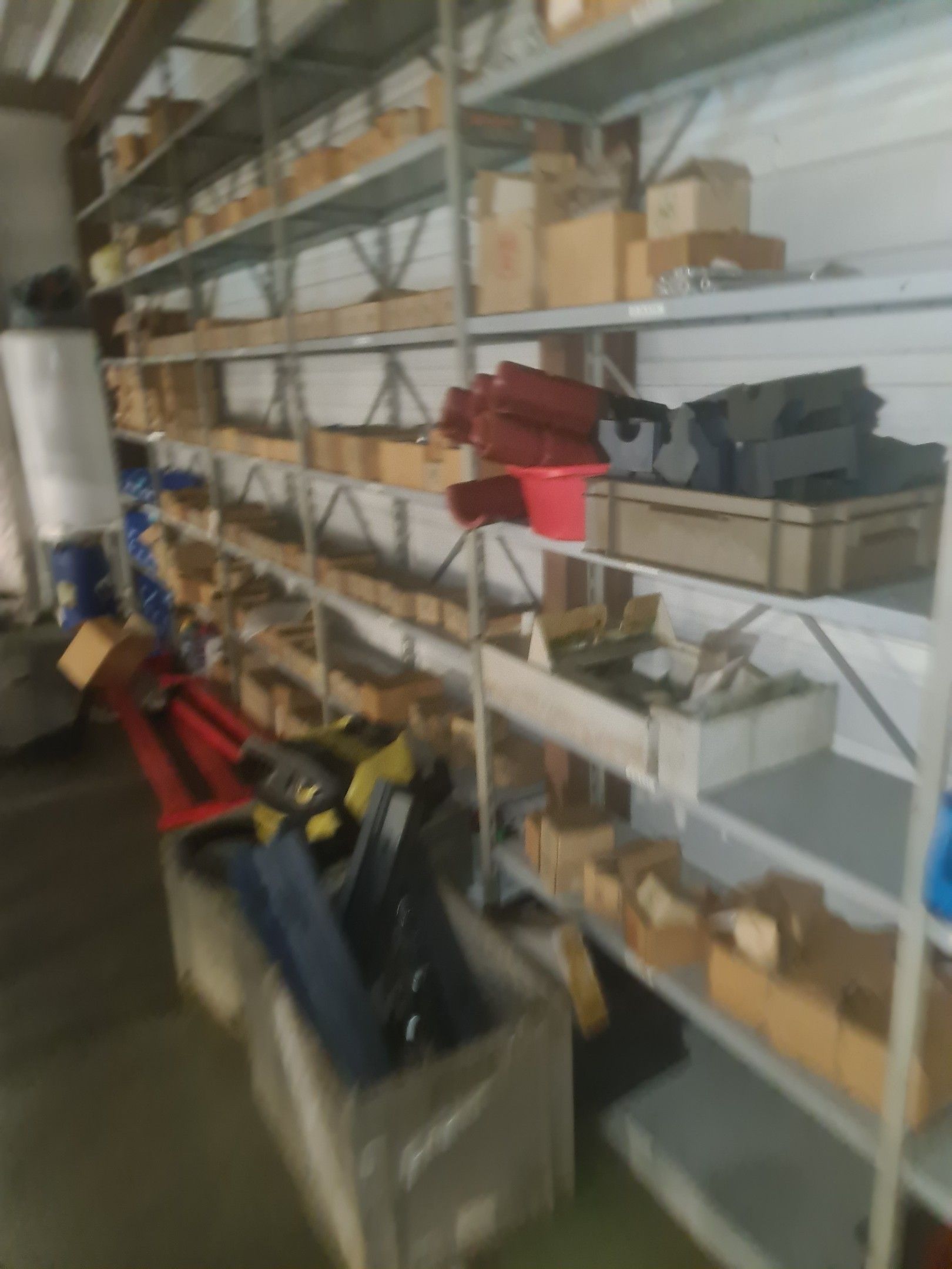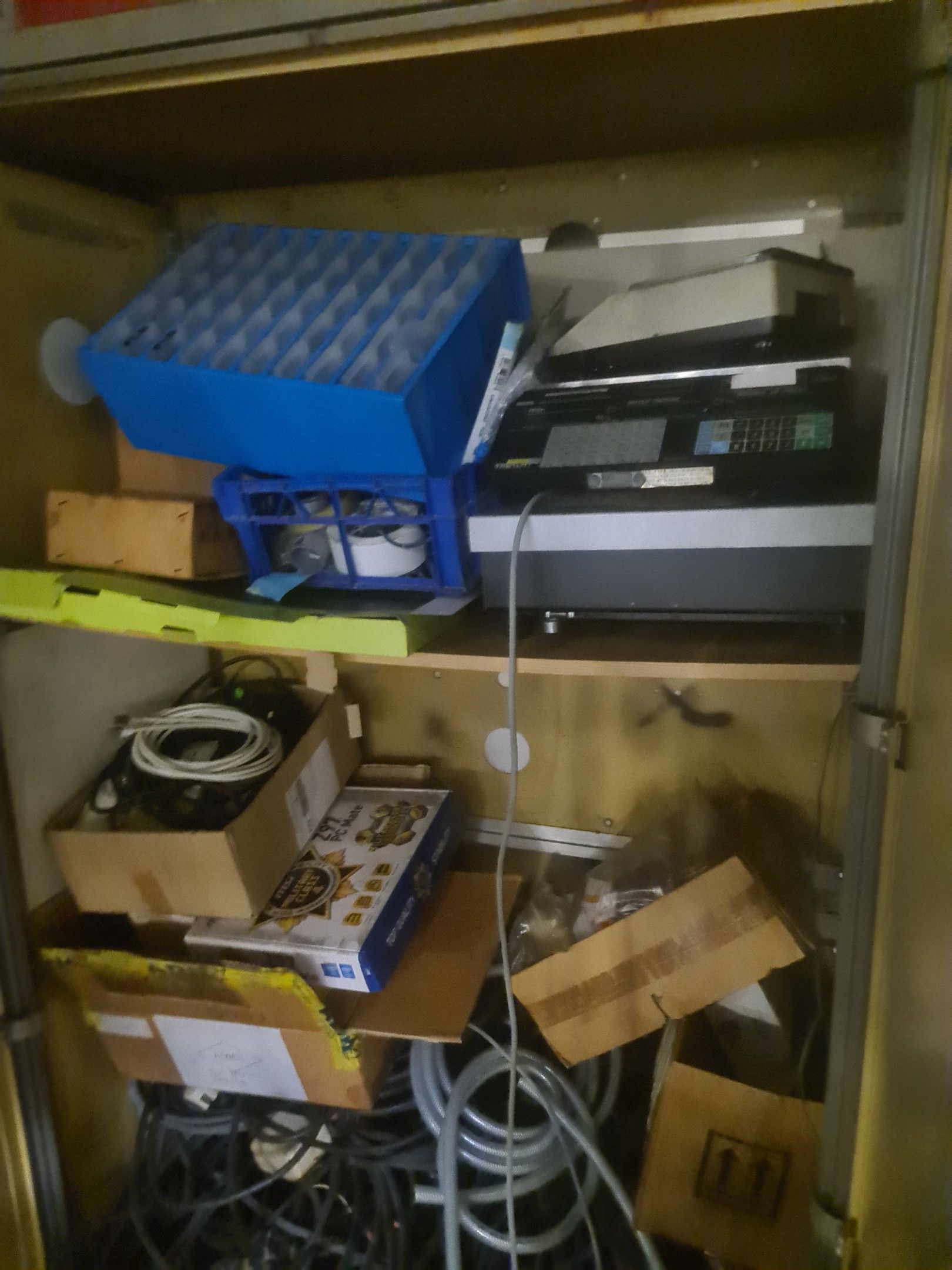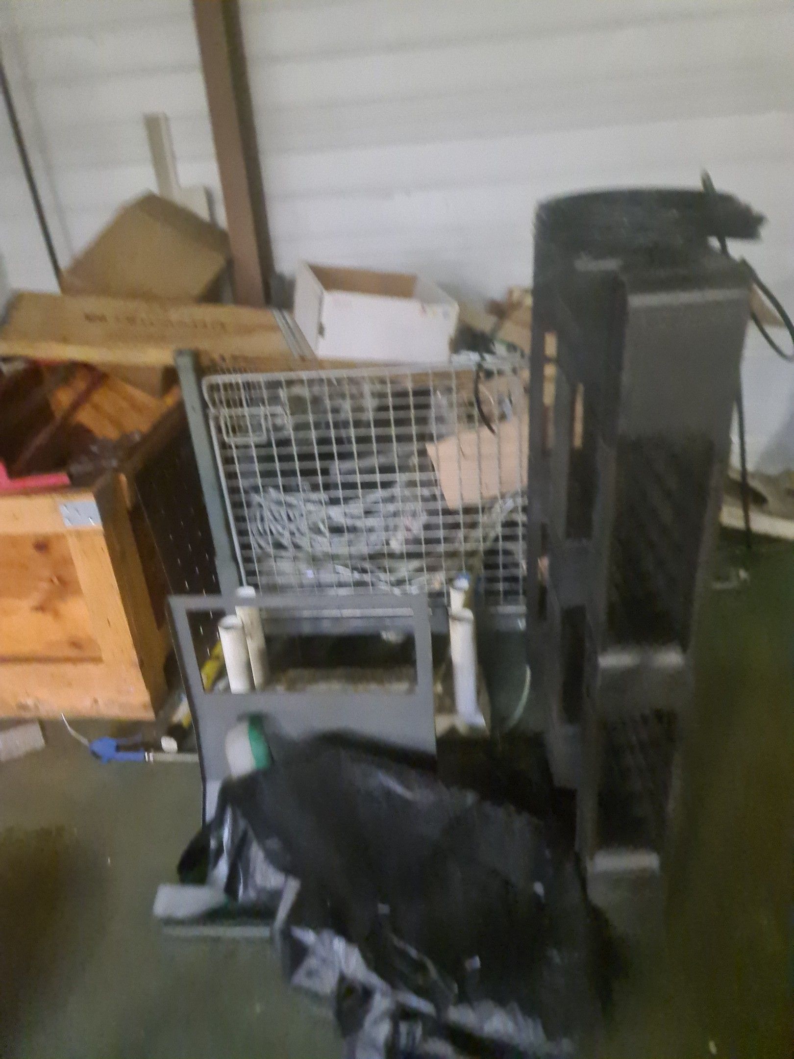 un transpalette manuel métallique jaune, un convoyeur à bande motorisé, un vestiaire métalliques gris deux casiers, une armoire métallique, balance de caisse hors service, aspirateur Karcher WD6P, pièces détachées
