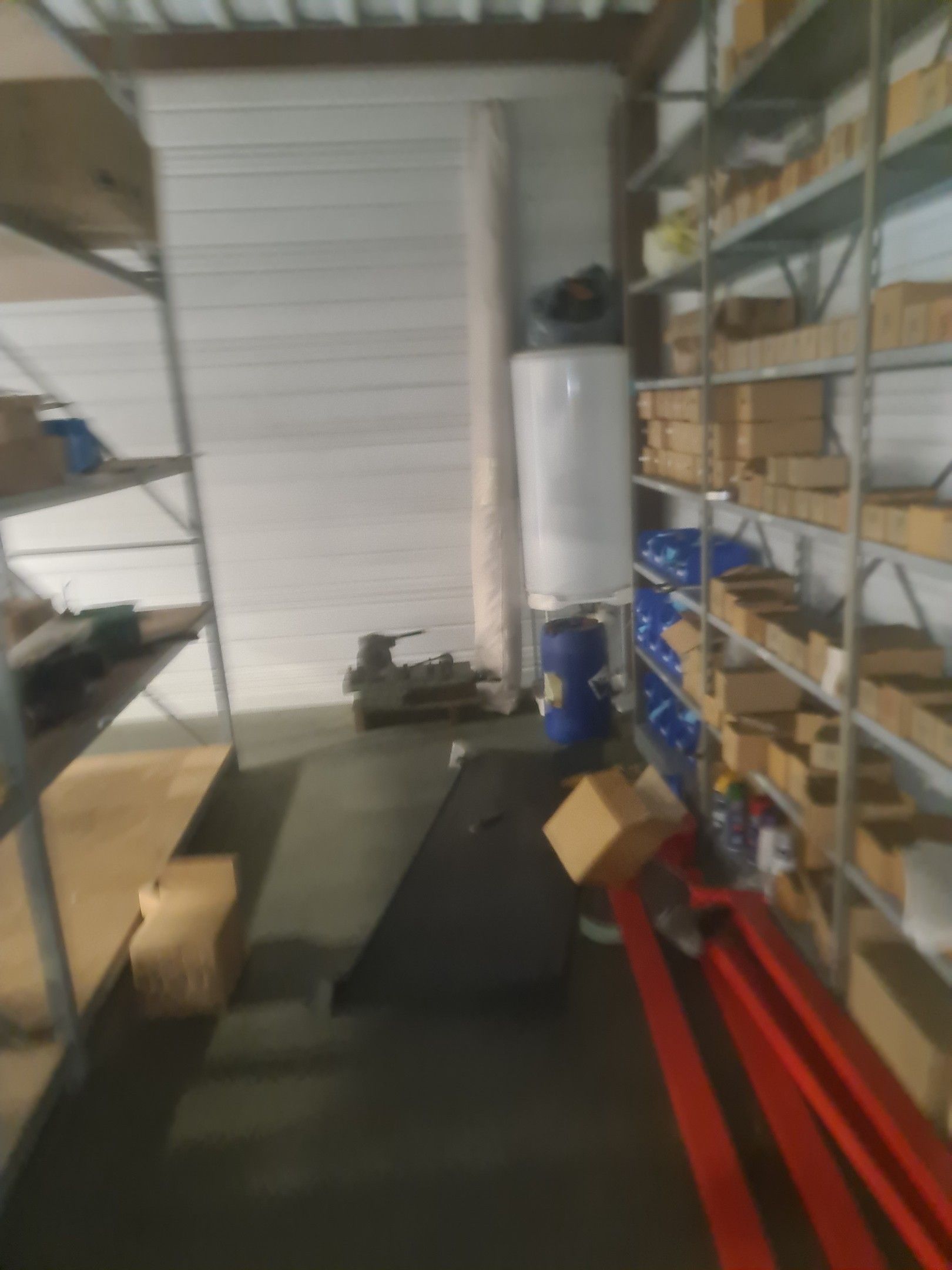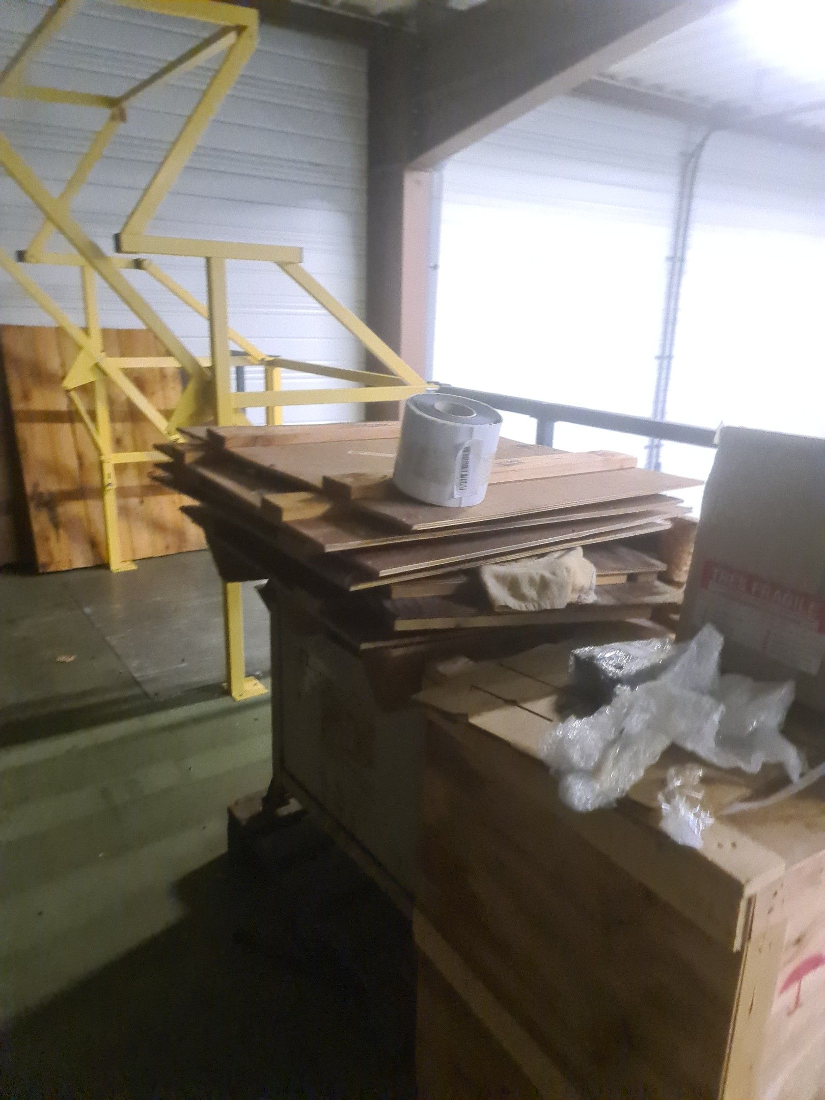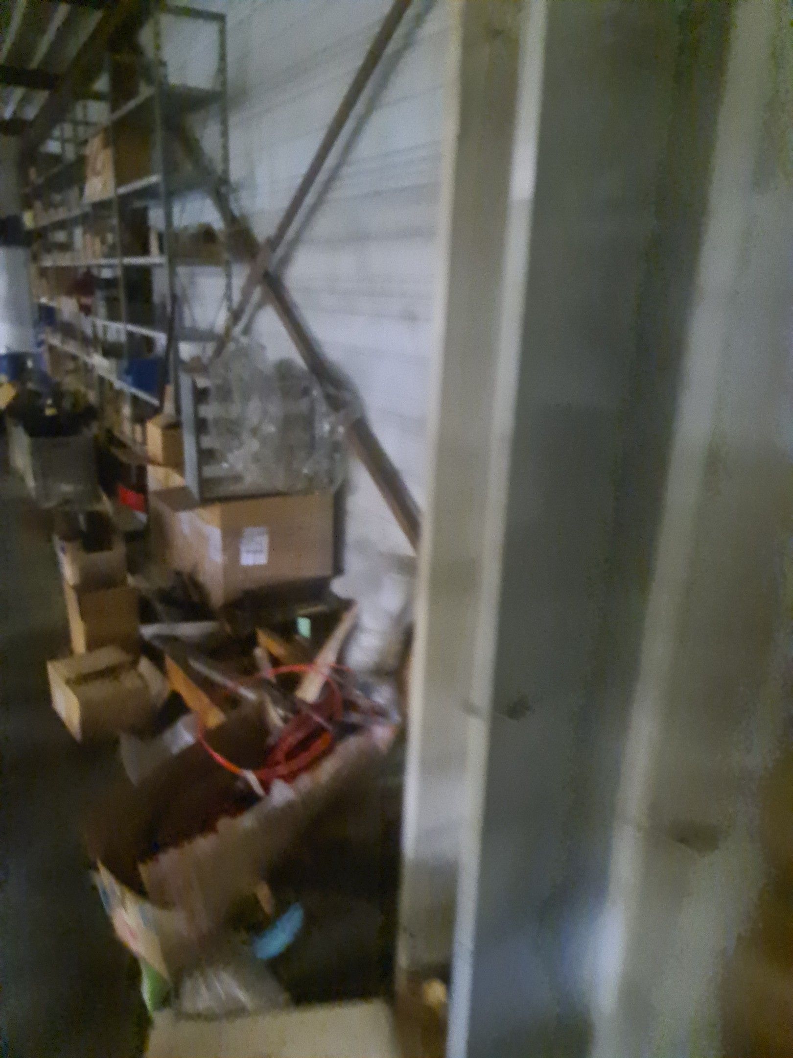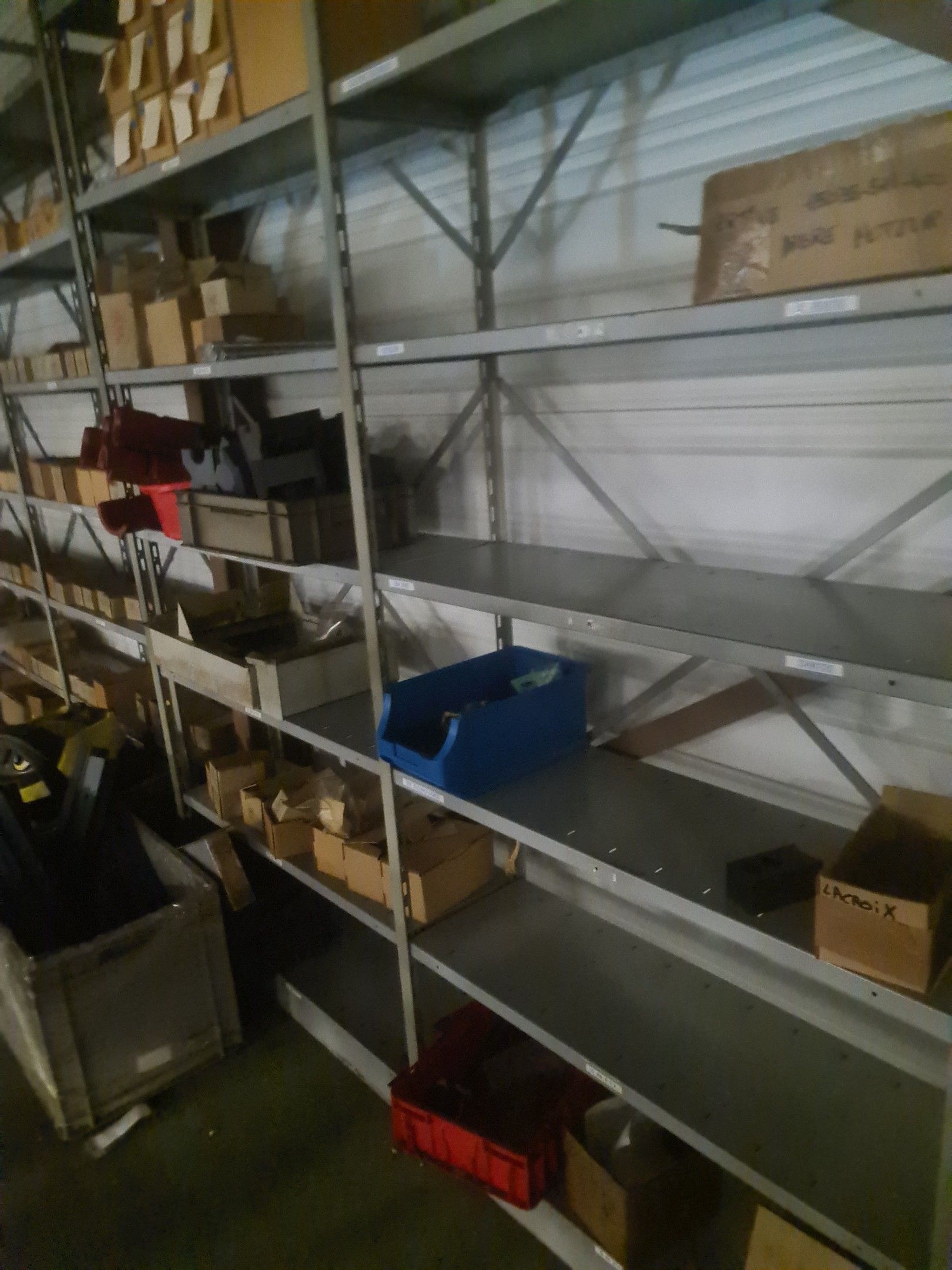 un transpalette manuel métallique jaune, un convoyeur à bande motorisé, un vestiaire métalliques gris deux casiers, une armoire métallique, balance de caisse hors service, aspirateur Karcher WD6P, pièces détachées