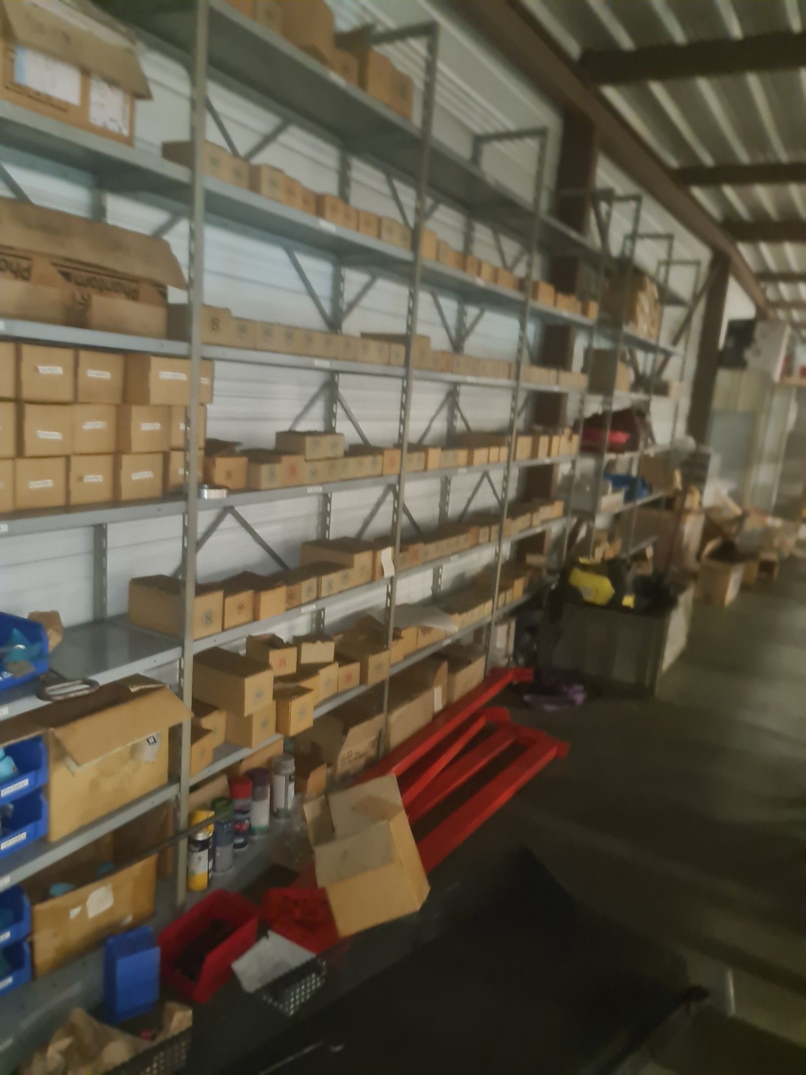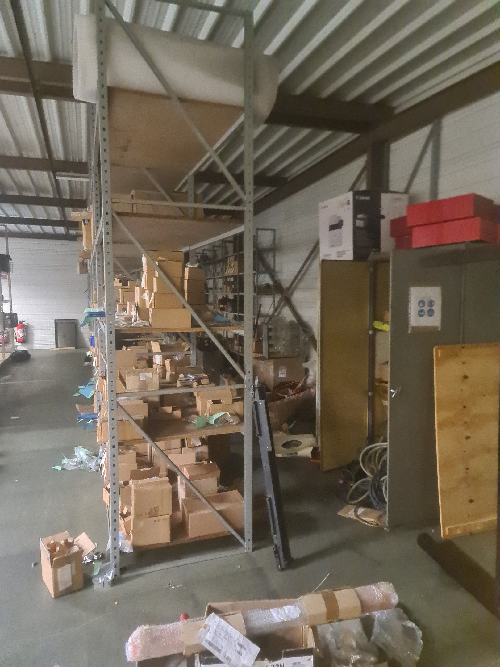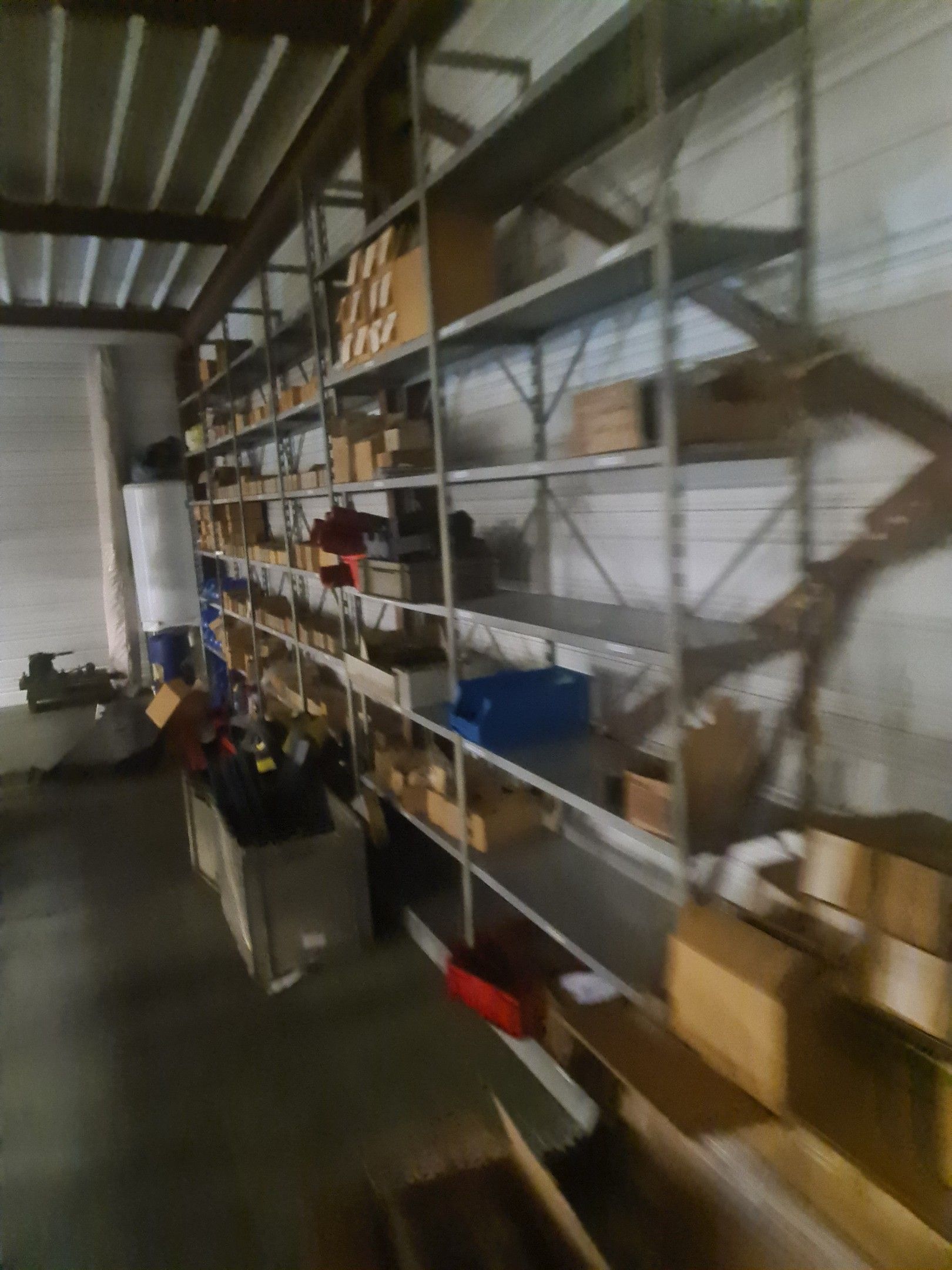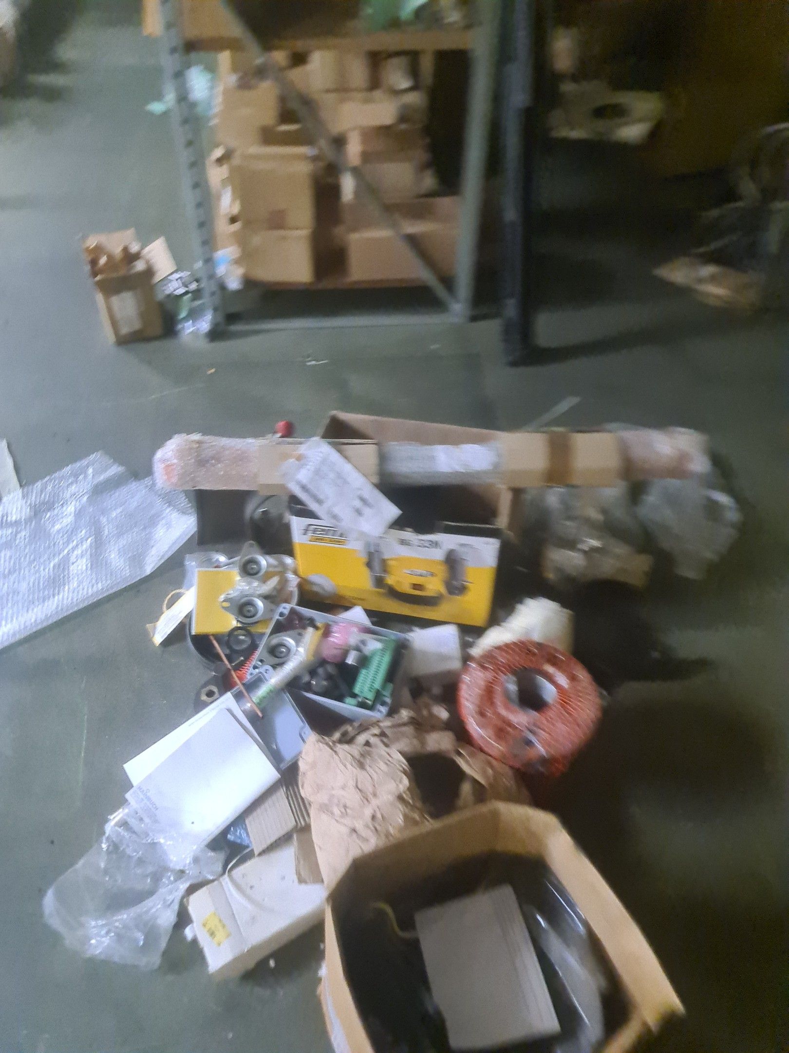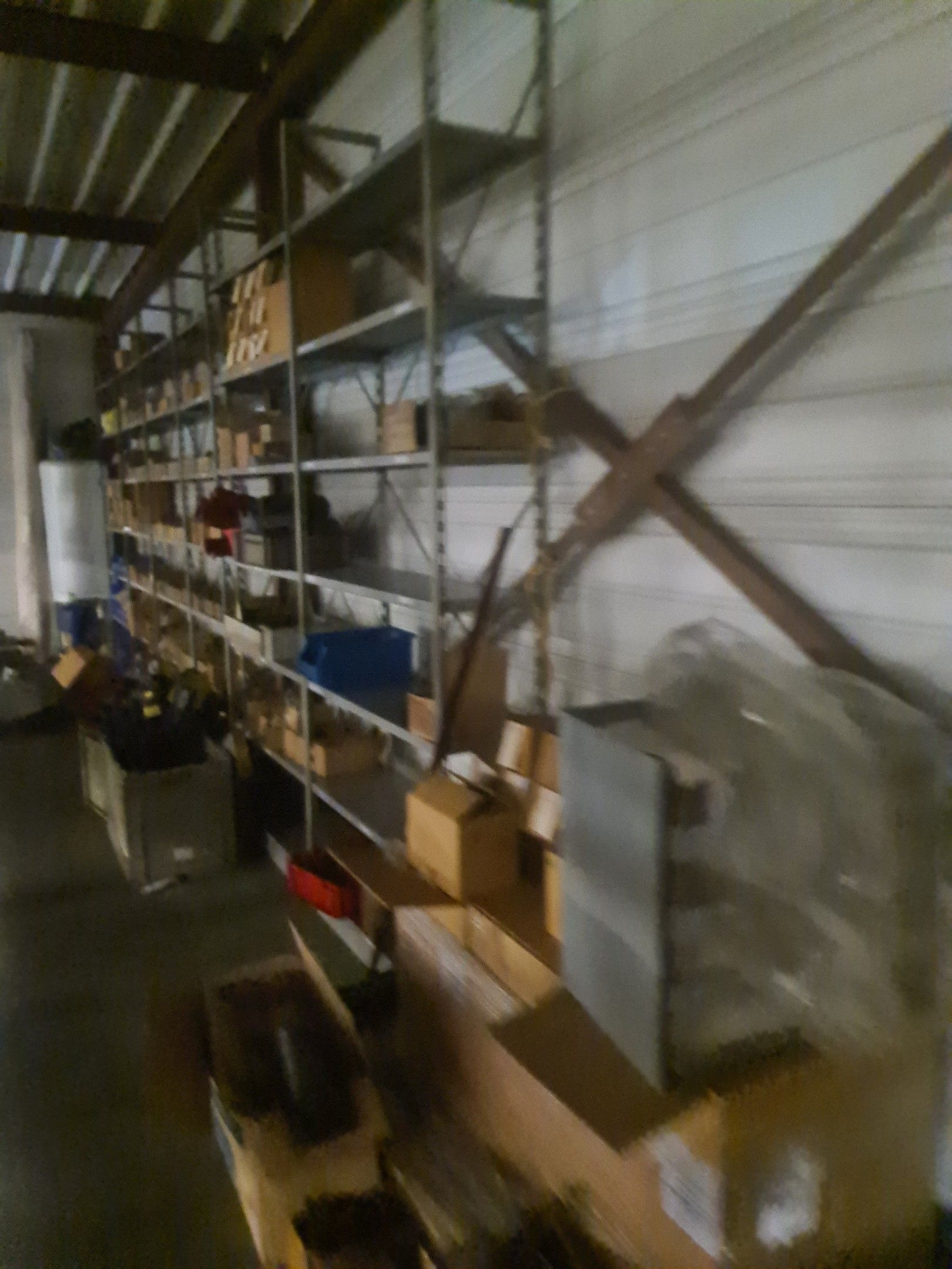 un transpalette manuel métallique jaune, un convoyeur à bande motorisé, un vestiaire métalliques gris deux casiers, une armoire métallique, balance de caisse hors service, aspirateur Karcher WD6P, pièces détachées