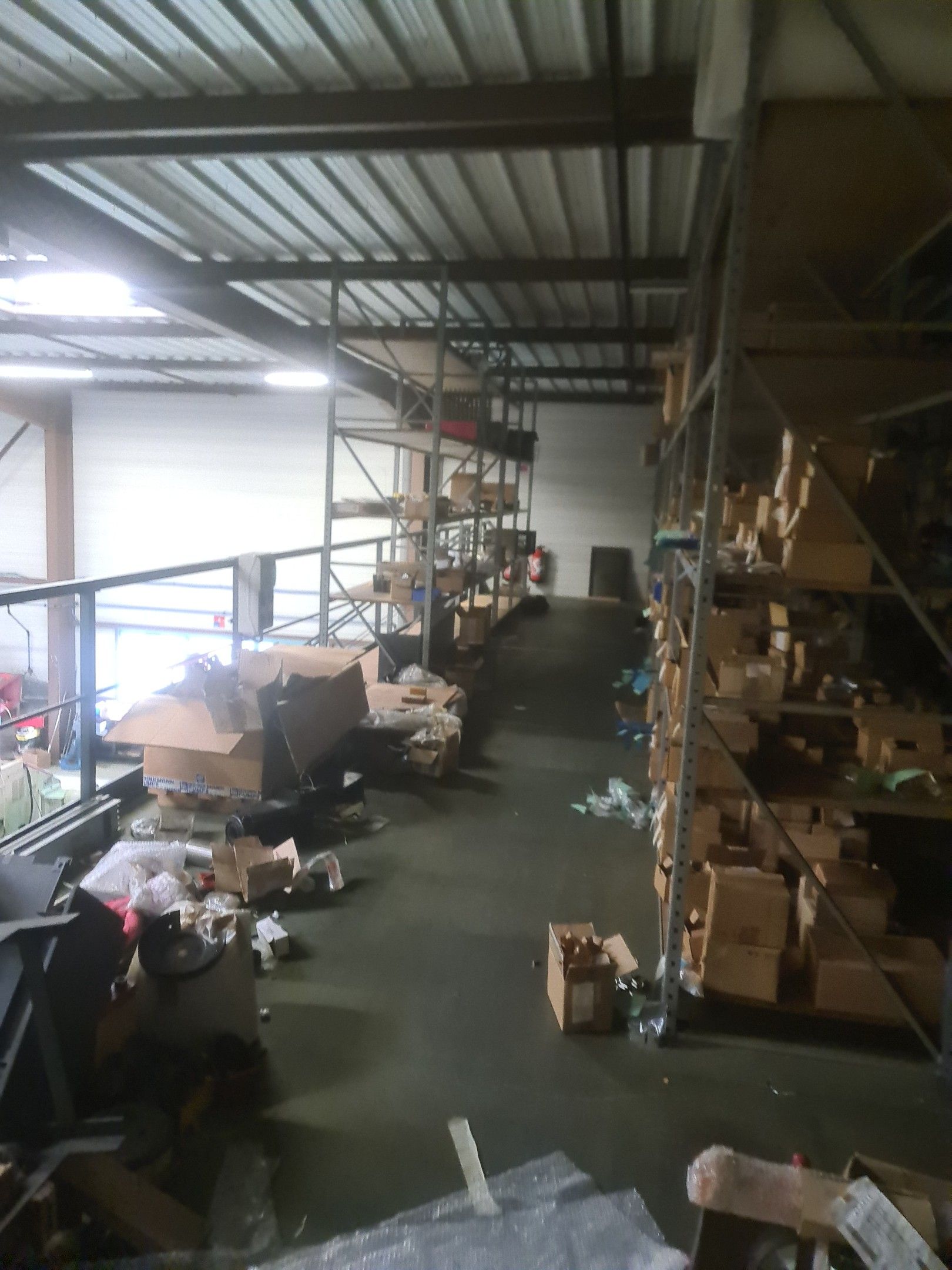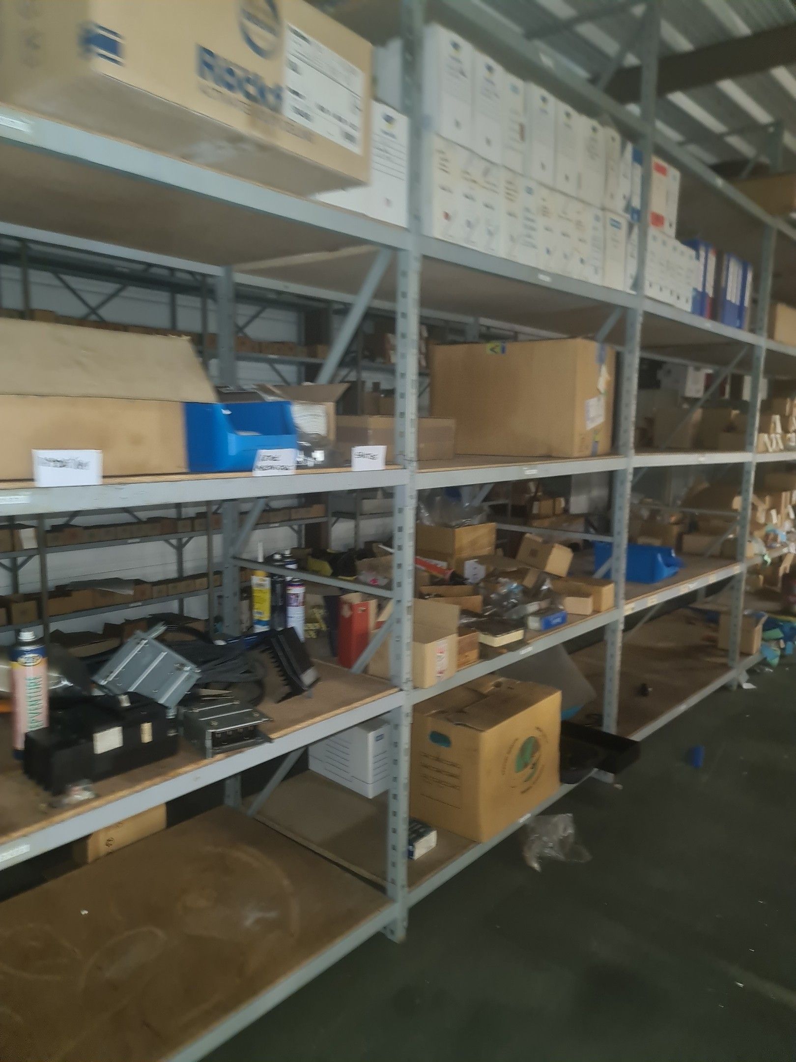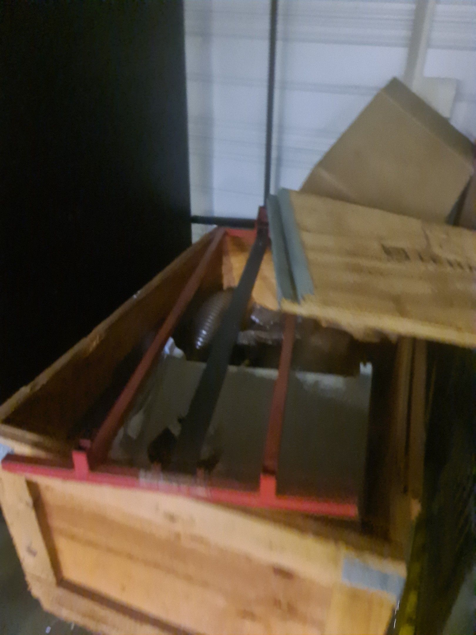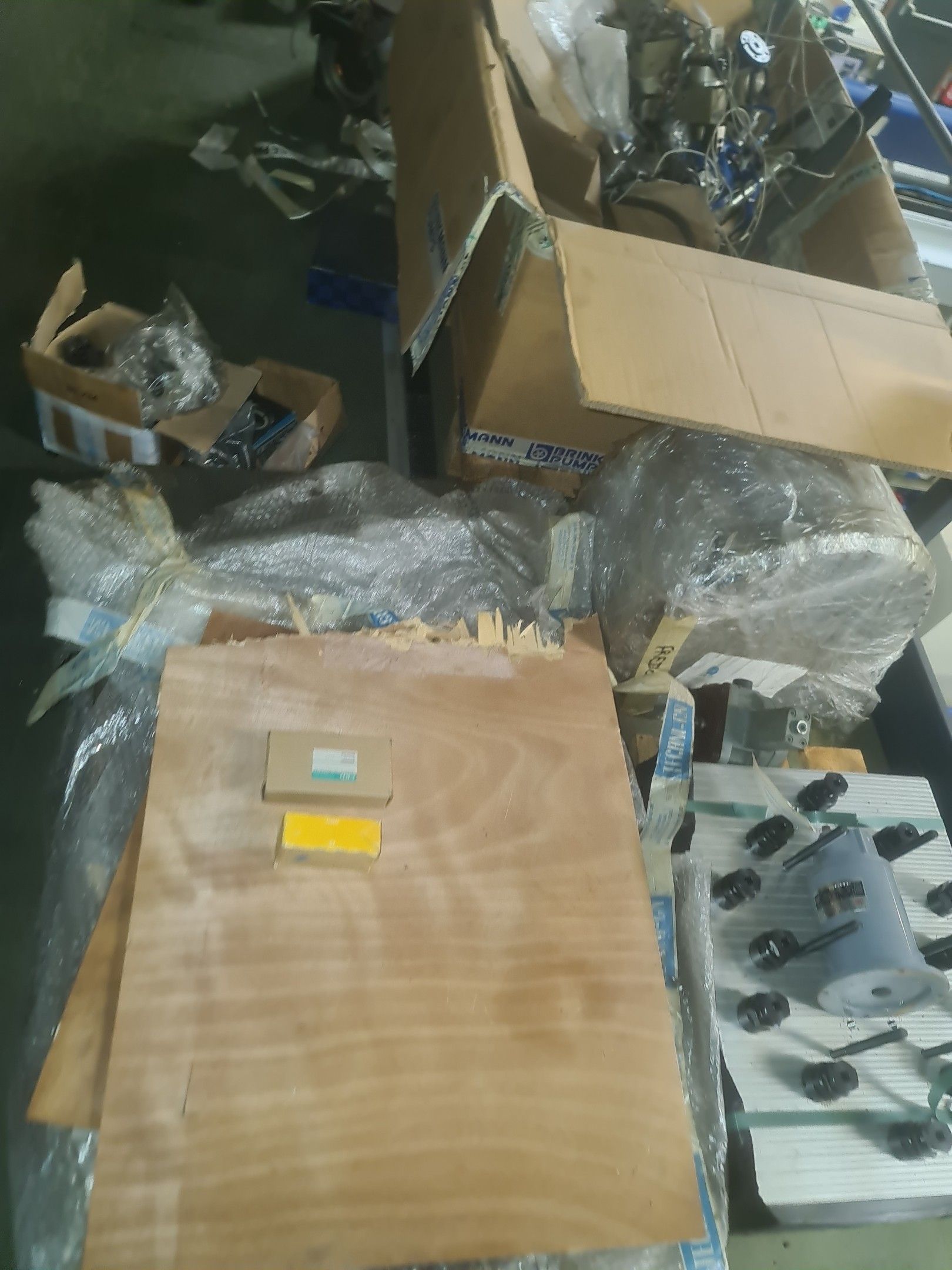 un transpalette manuel métallique jaune, un convoyeur à bande motorisé, un vestiaire métalliques gris deux casiers, une armoire métallique, balance de caisse hors service, aspirateur Karcher WD6P, pièces détachées