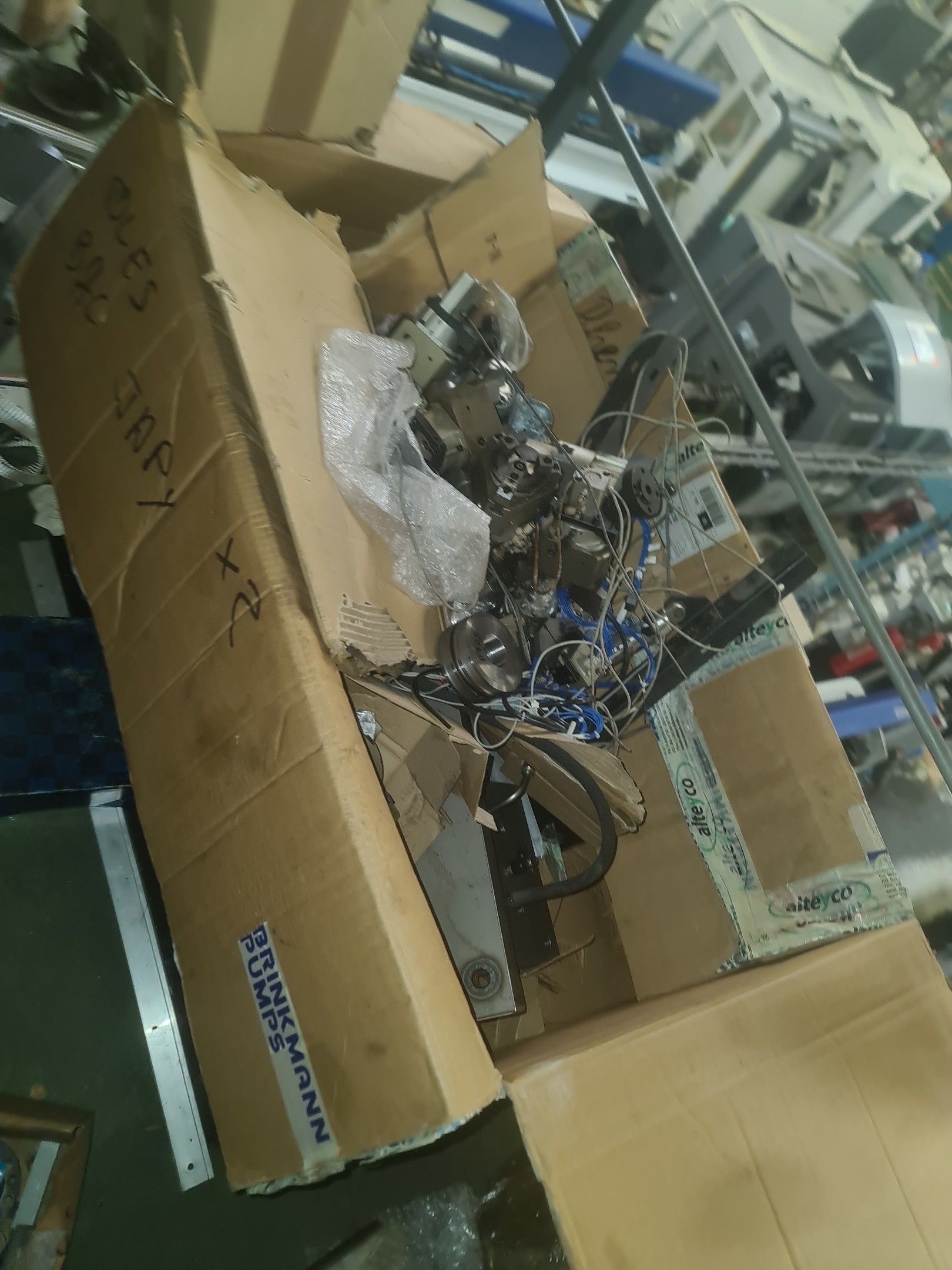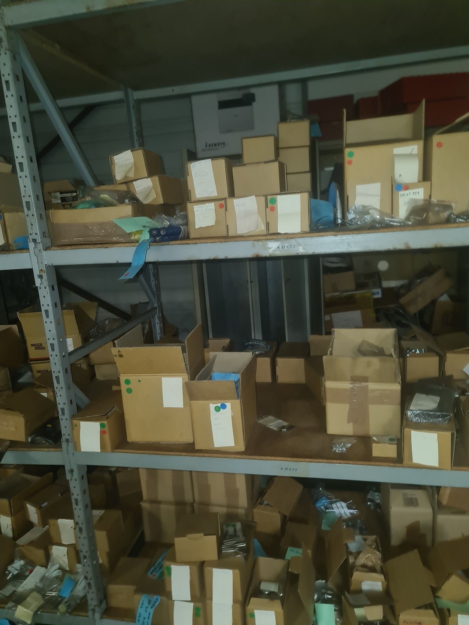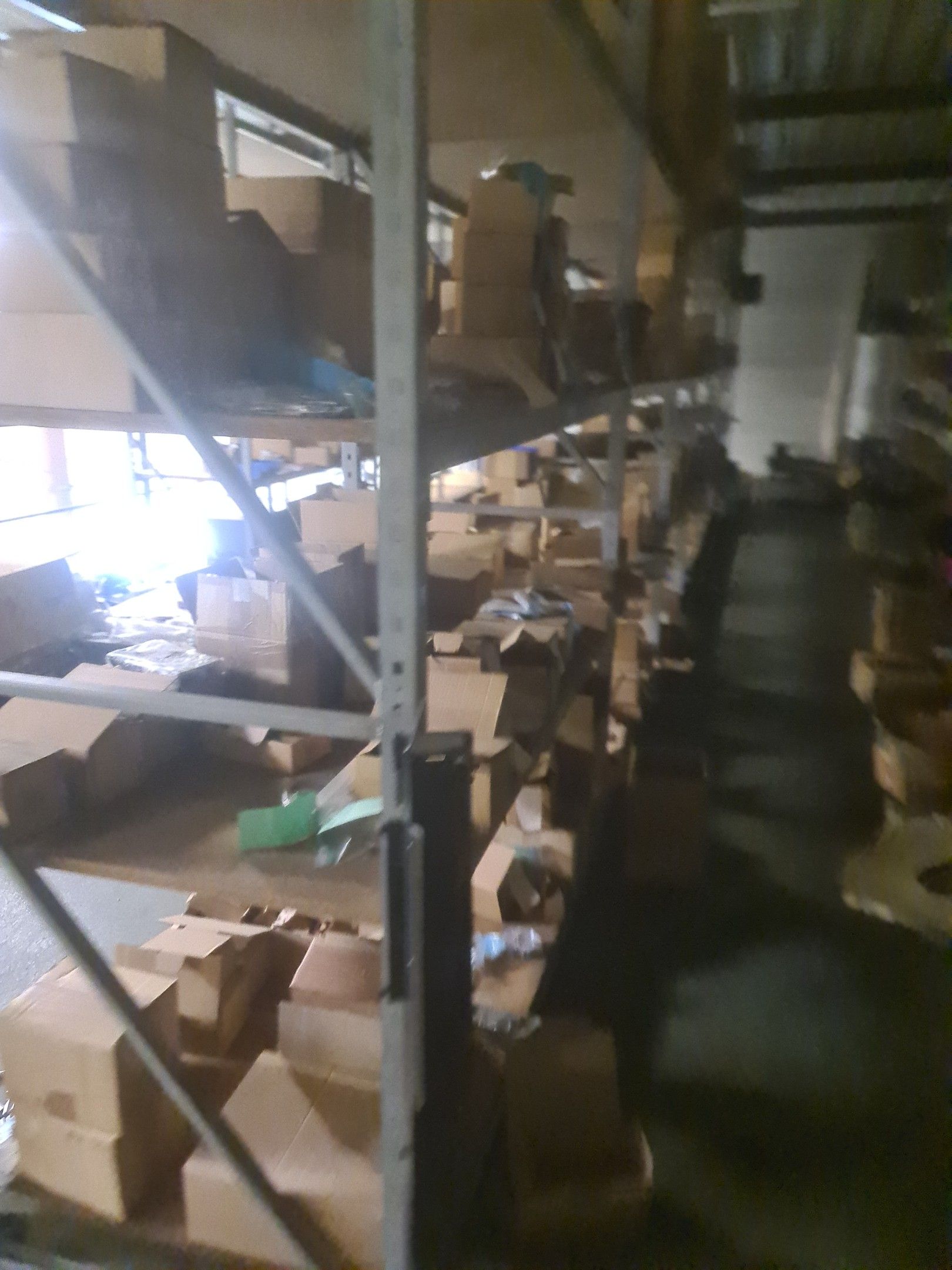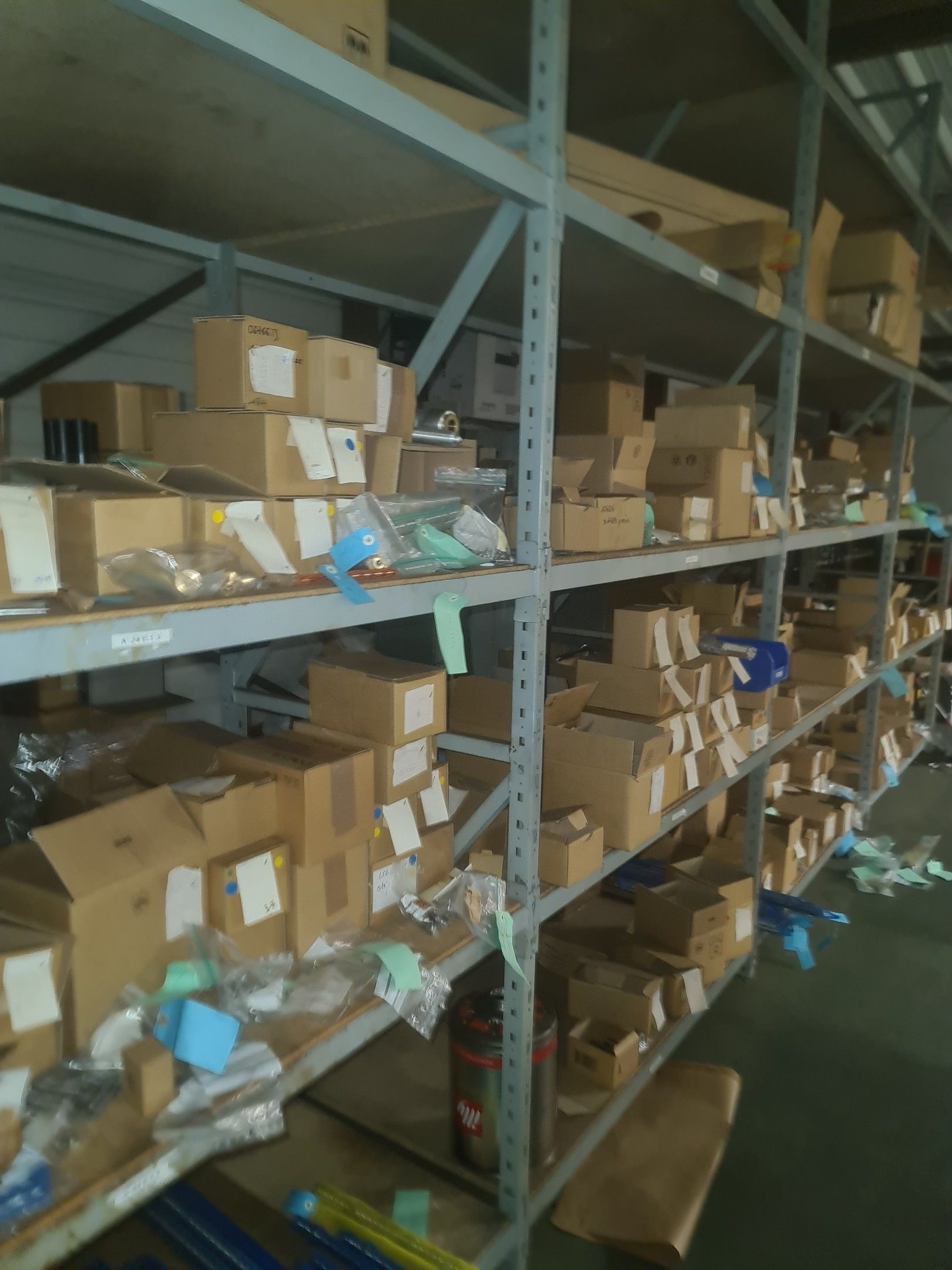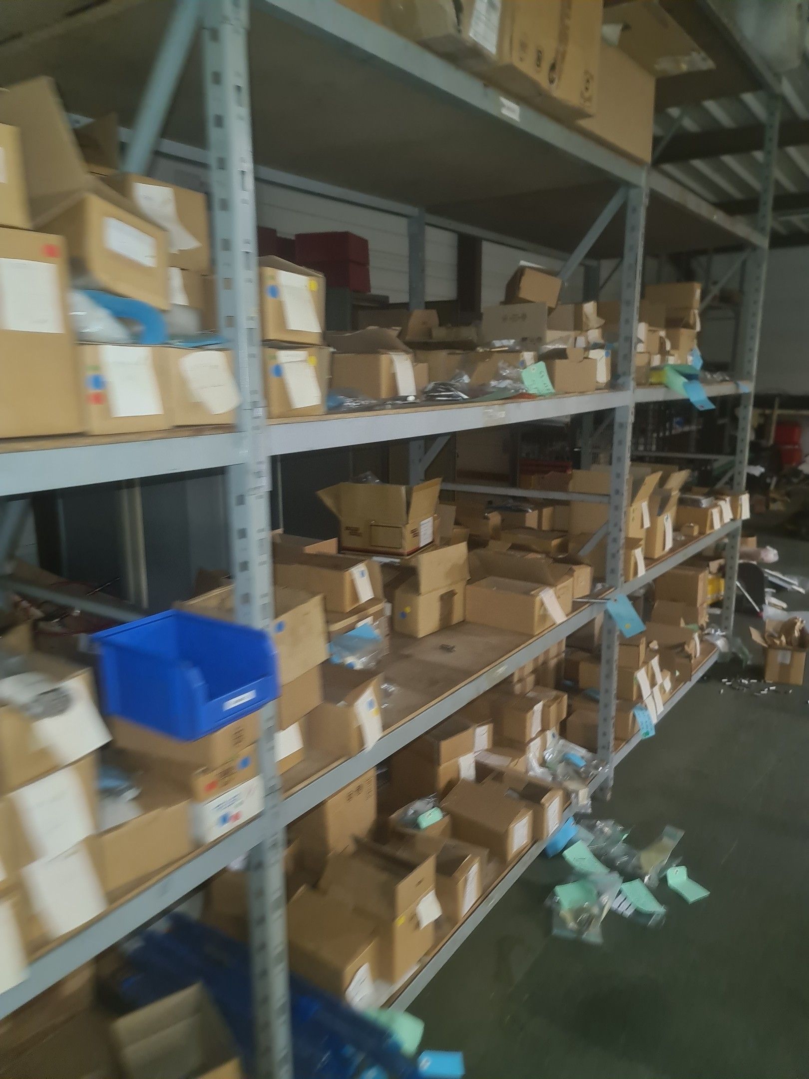 un transpalette manuel métallique jaune, un convoyeur à bande motorisé, un vestiaire métalliques gris deux casiers, une armoire métallique, balance de caisse hors service, aspirateur Karcher WD6P, pièces détachées